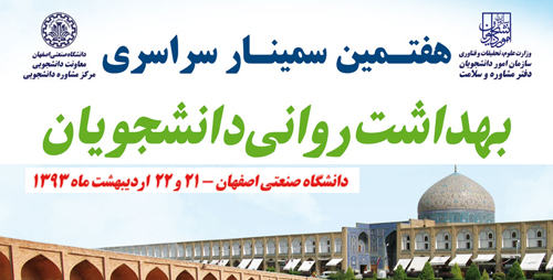 هفتمین سمینار سراسری بهداشت روانی دانشجویان توسط دفتر مشاوره وسلامت سازمان امور دانشجویان وزارت علوم، تحقیقات و فناوری ومرکز مشاوره دانشجویی دانشگاه صنعتی اصفهان، 21و 22 اردیبهشت 1393 در این دانشگاه برگزار خواهد شد.
