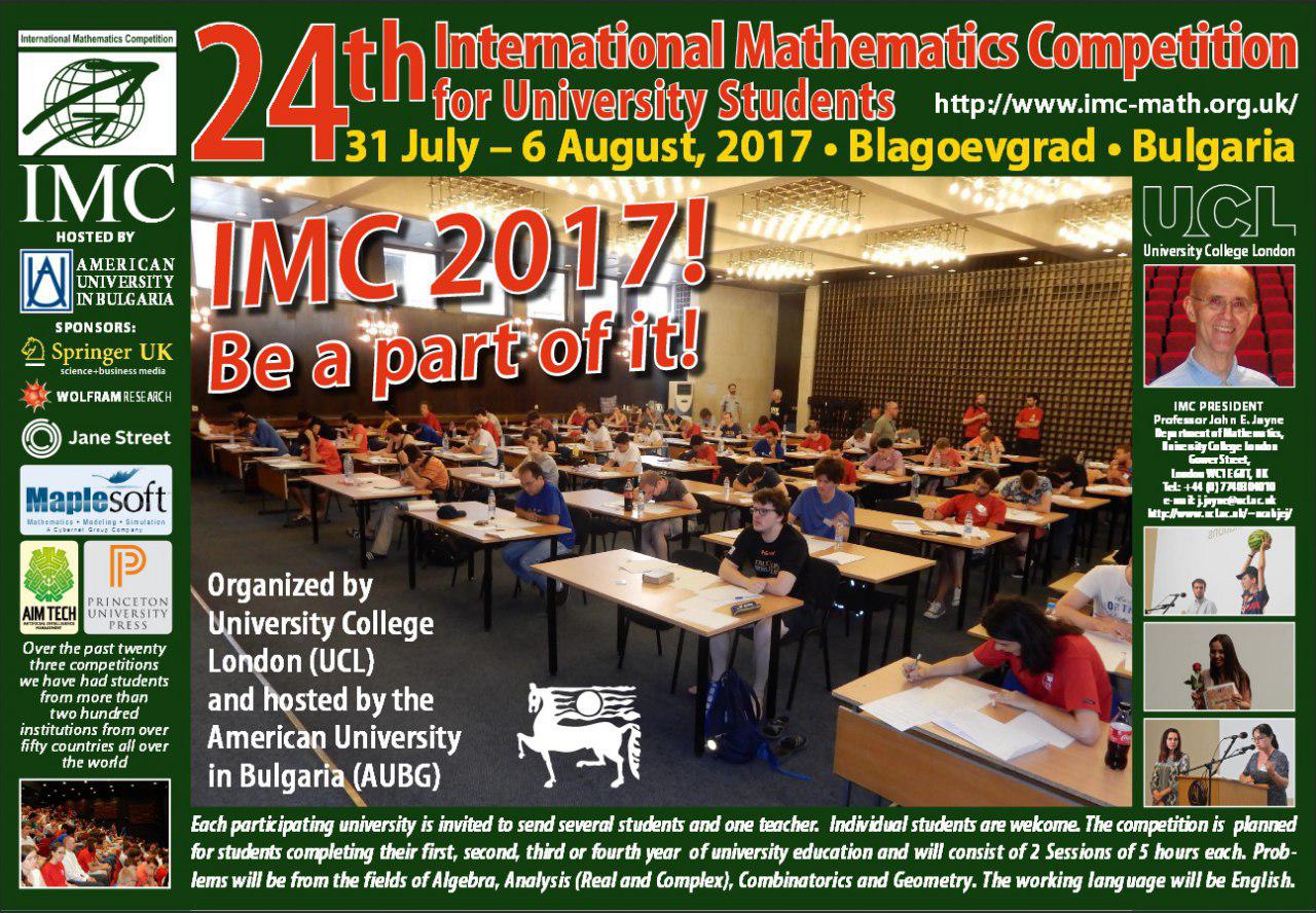 گفتنی است: بیست و چهارمین دوره مسابقات بین المللی ریاضی بلغارستان (IMC2017) با حضور بیش از 300 شرکت کننده در قالب 70 تیم از کشورهای مختلف جهان برگزار شد.