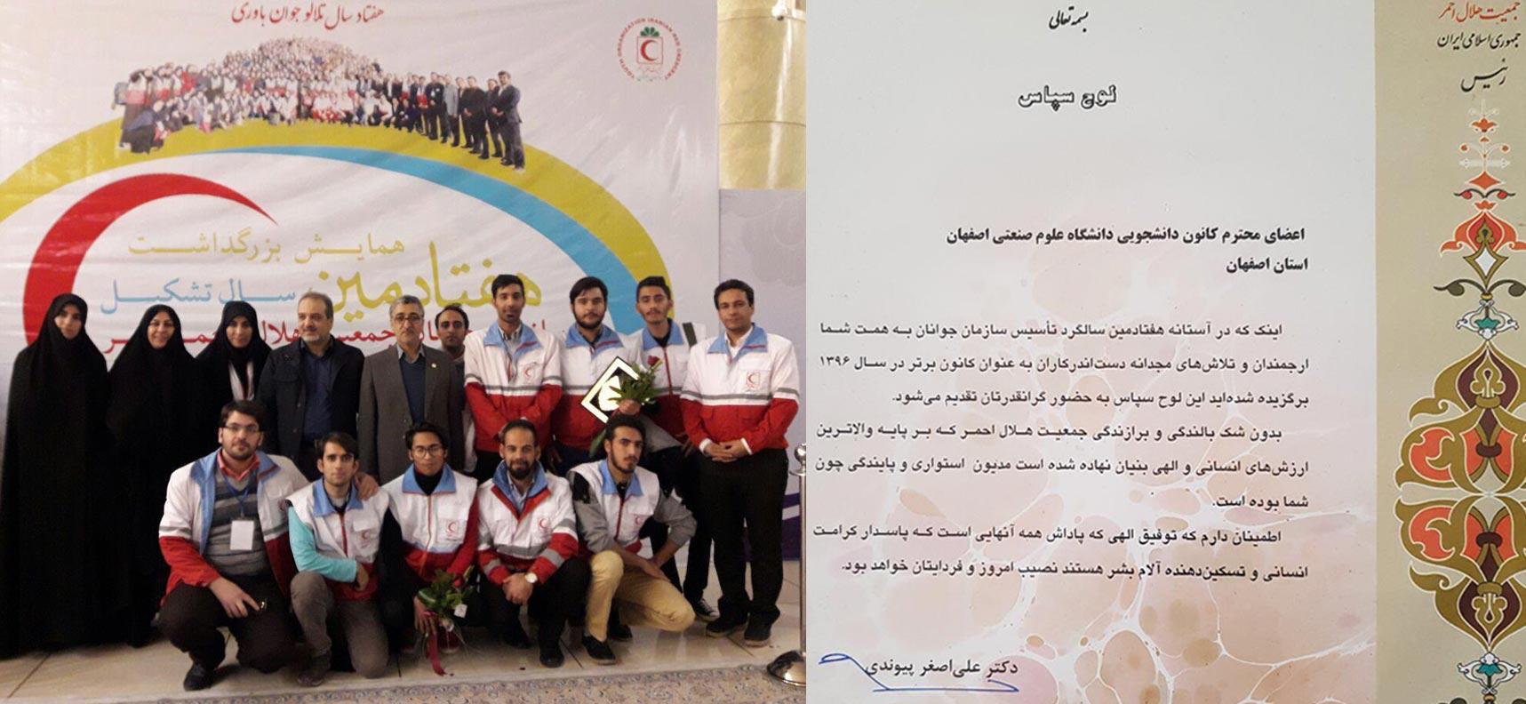 در این مراسم که با حضور علی اصغر پیوندی رئیس جمعیت هلال احمر و جمعی از مسئولان دیگر این جمعیت و نیز تعدادی از نمایندگان مجلس برگزار شد، کانون دانشجویی هلال احمر دانشگاه صنعتی اصفهان از ميان ١٠١٨كانون دانشجويي كشور، بعنوان کانون برتر کشور در سال 1396 معرفی شد.