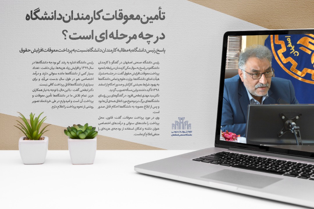 رئیس دانشگاه صنعتی اصفهان در گفتگو با کارمندان دانشگاه و در پاسخ به سوال مکرر کارمندان در رابطه با نحوه پرداخت معوقات افزایش حقوق گفت : در جلسه مشترك هيأت امناي دانشگاهها، وزارت علوم و تمامي دانشگاهها به بهبود شرايط معيشتي كاركنان و صدور احكام از اسفند 98 تأكيد داشتند و اين مسأله تصويب گرديد.