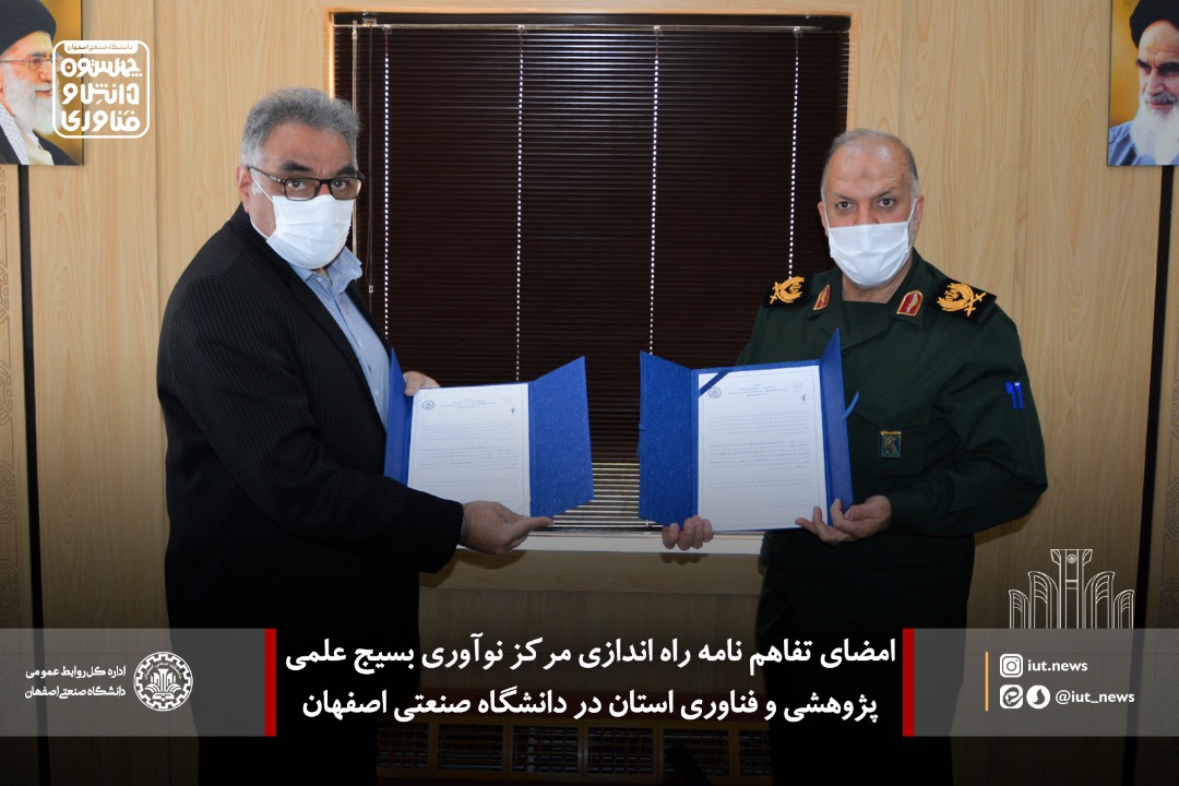 با حضور سردار فداء فرمانده سپاه صاحب الزمان(عج) اصفهان، تفاهم نامه همكاري مشترك دانشگاه صنعتي اصفهان و سازمان بسيج علمي، پژوهشي و فناوري كشور براي راه اندازي مركز نوآوي علمي و فناوري و به منظور حل مسايل اولويت دار استان صبح امروز شنبه19تيرماه منعقد شد.