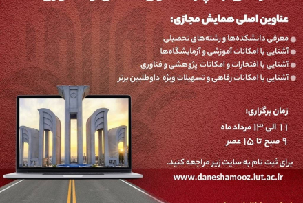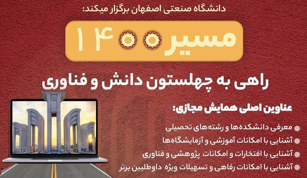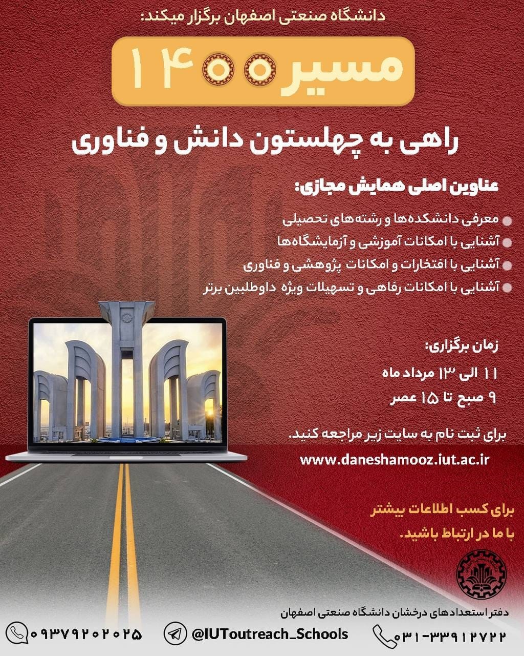 دفتر استعدادهای درخشان دانشگاه صنعتی اصفهان همایش'مسیر1400' ویژه معرفی رشته های تحصیلی این دانشگاه را در تاریخ 11 تا 13 مرداد ماه از ساعت 9 الی 15 به صورت برخط برگزار می نماید.