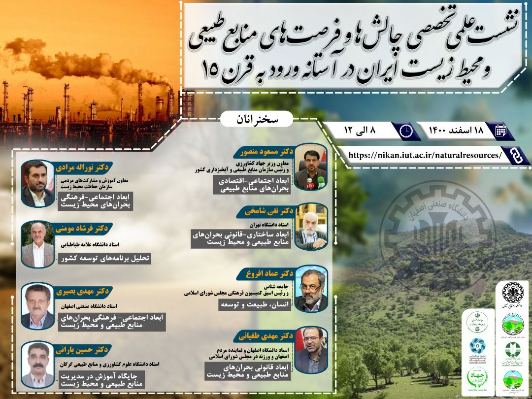 نشست علمي- تخصصي چالش ها و فرصت هاي منابع طبيعي و محيط زيست ايران در آستانه ورود به قرن پانزدهم، روز 18 اسفندماه به ميزباني دانشكده مهندسي منابع طبيعي دانشگاه صنعتي اصفهان به صورت برخط برگزار مي شود.