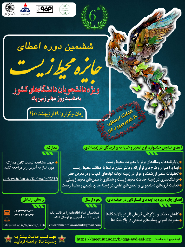 ششمين دوره اعطاي جايزه محيط زيست ويژه دانشجويان دانشگاه هاي كشور با تقدير از تلاش هاي علمي – پژوهشي دانشجويان كشور در عرصه محيط زيست، همزمان با روز جهاني زمين پاك –19 ارديبهشت -1401 به ميزباني دانشگاه صنعتي اصفهان برگزار مي شود.