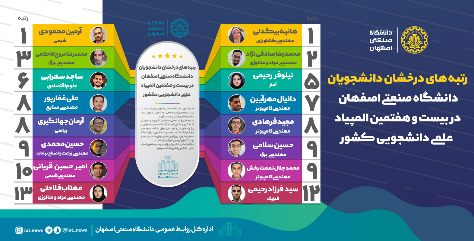 بر اساس این نتایج، آرمین محمودی دانشجوی رشته شیمی موفق به کسب رتبه اول در این رقابت علمی شد. 3 دانشجوی رشته مهندسی کامپیوتر، دانیال مهرآیین، مجید فرهادی و محمدجلال نعمتبخش، رتبههای 7 تا 9 را کسب کردند. همچنین در رشته مهندسی کشاورزی گرایش زراعت و اصلاح نباتات هانیه بیگدلی رتبه اول و حسین محمدی رتبه 9 را بهدست آوردند. در گروه مهندسی مواد و متالورژی نیز محمدرضا صادقی نژادپاریزی رتبه 2 را کسب کرد.