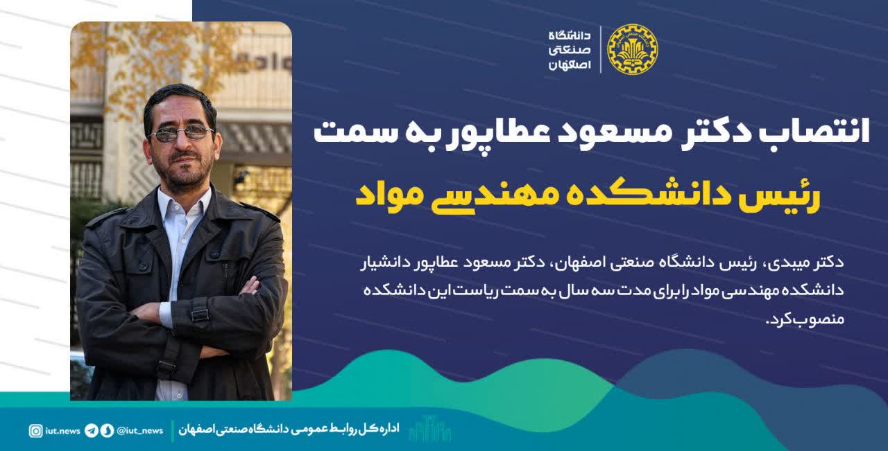 دکتر میبدی، رئیس دانشگاه صنعتی اصفهان، دکتر مسعود عطاپور دانشیار دانشکده مهندسی مواد را برای مدت سه سال به سمت رياست این دانشکده منصوب كرد.