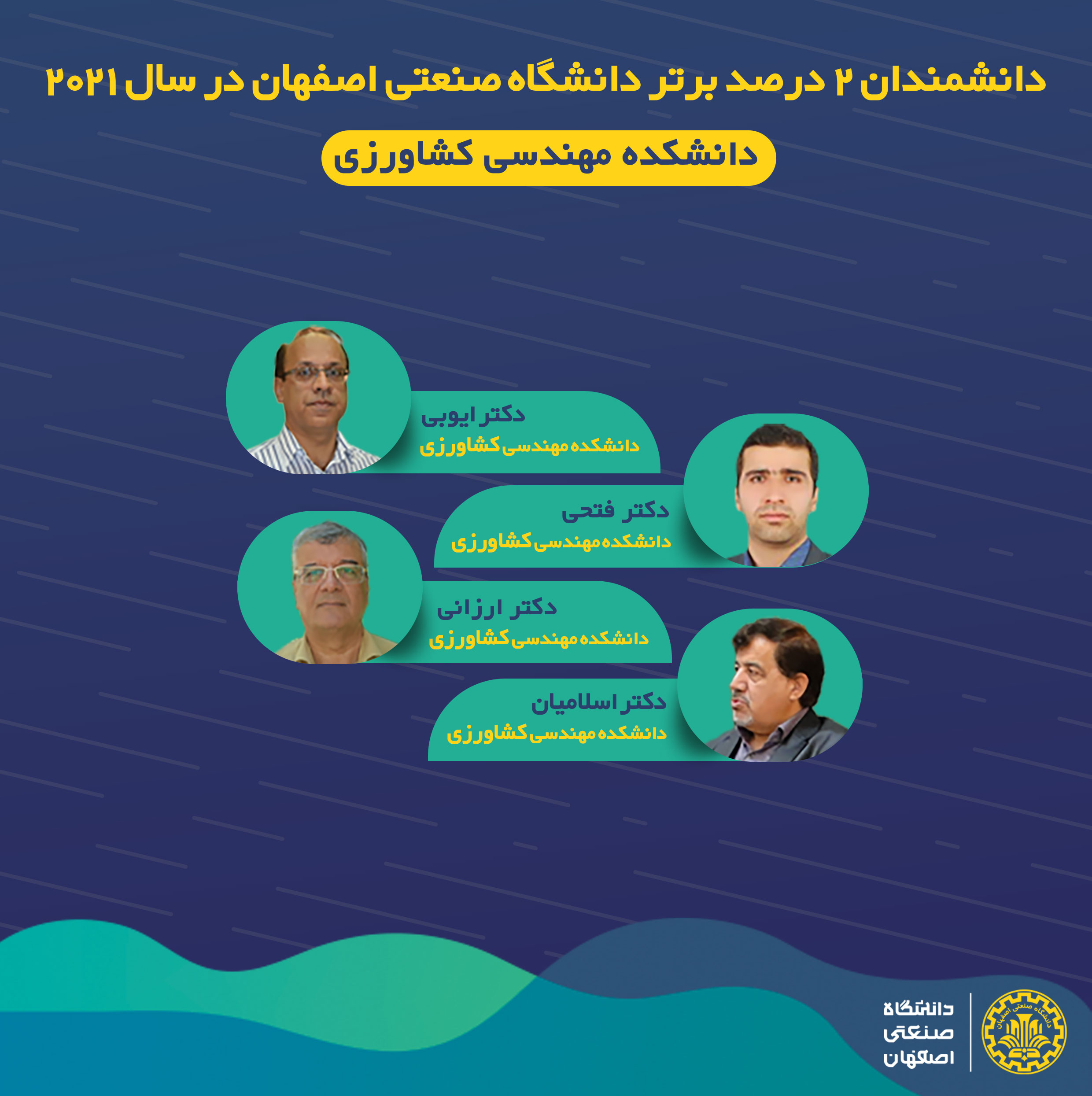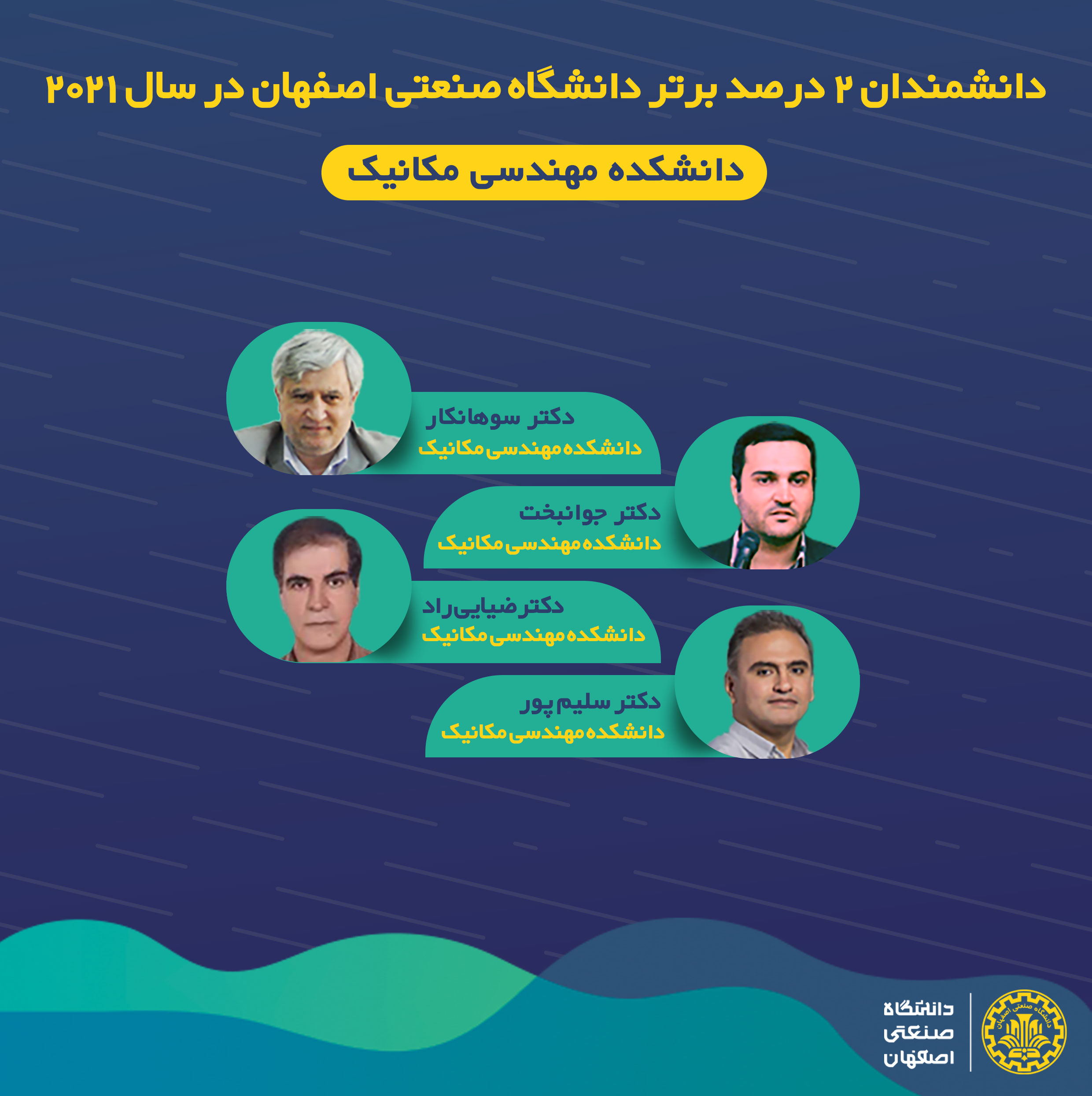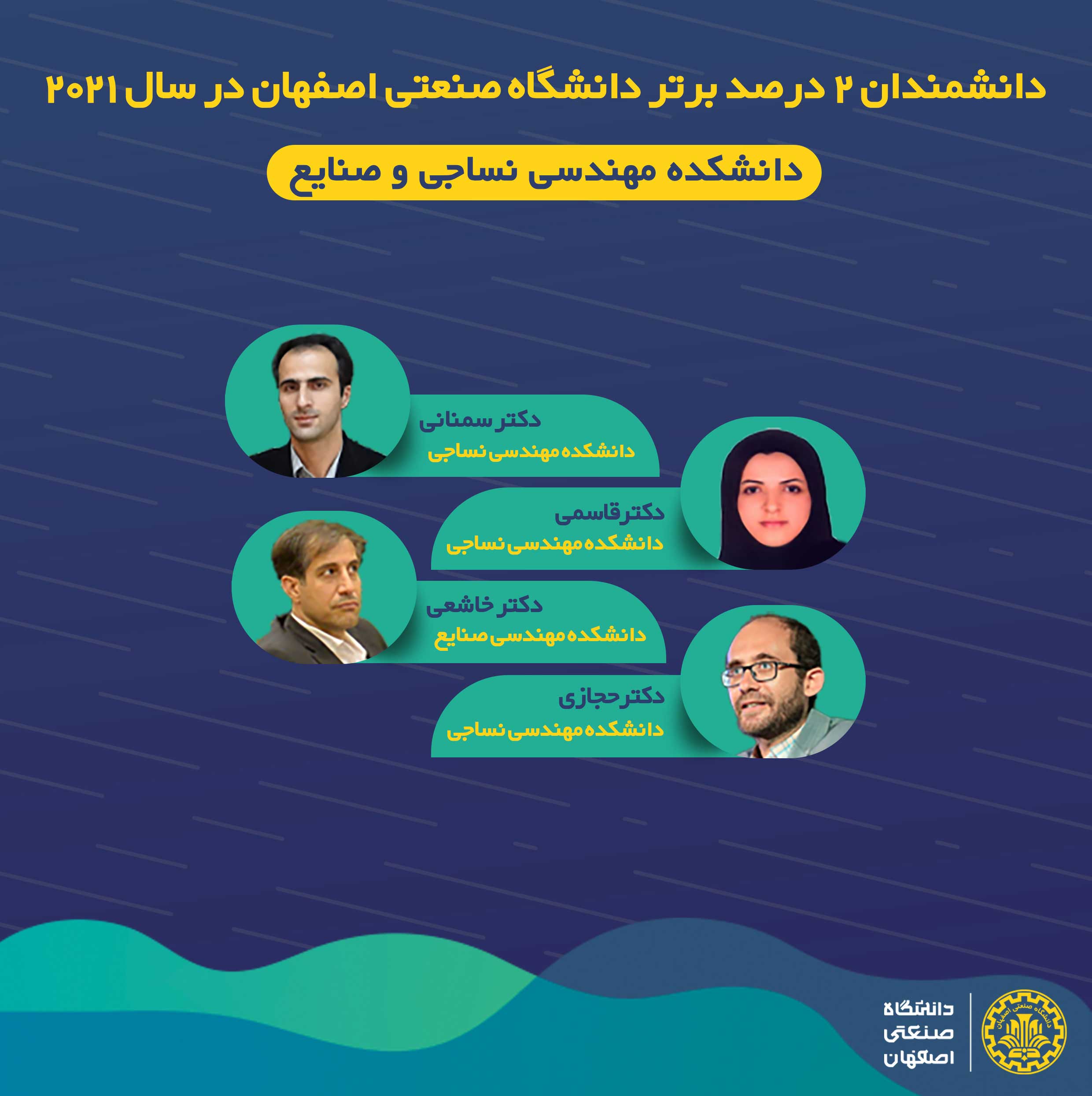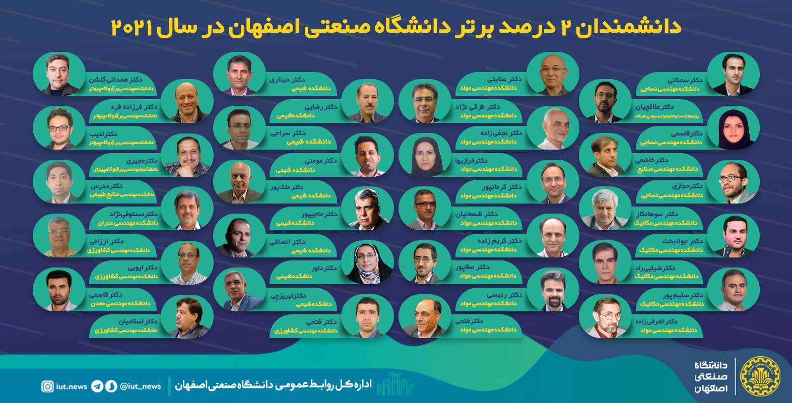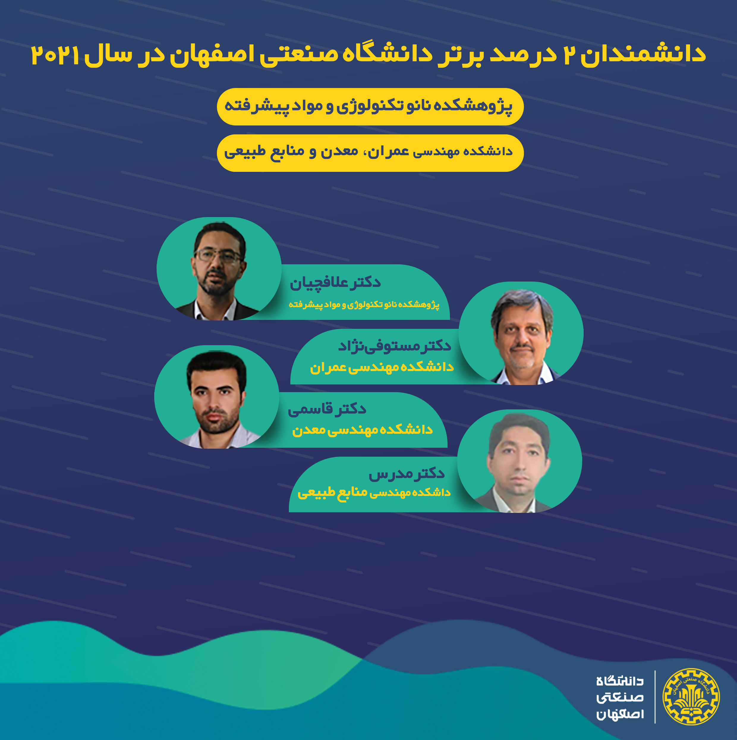 به گزارش روابط عمومی دانشگاه صنعتی اصفهان، بر اساس داده هاي منتشره توسط تيم تحقيقاتي دانشگاه استنفورد، فهرست ۱۰۰ هزار دانشمند پر استناد در تمامی رشتهها و نیز دانشمندان دو درصد برتر حوزههای علمی با بررسي و ارزيابي دادههاي پايگاه اسكوپوس، تا پایان سال 2021 اعلام شده است.