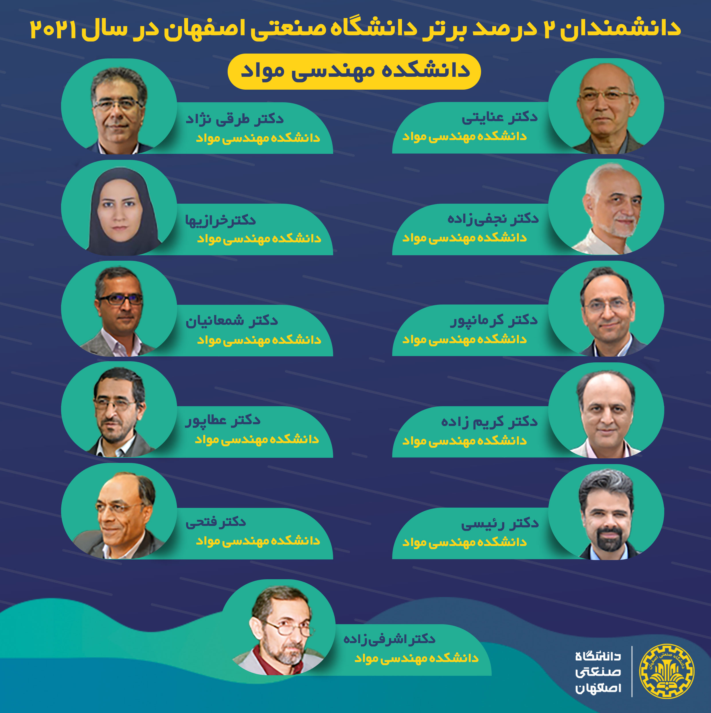 در این فهرست نام اعضای هئیت علمی دانشکده مهندسی مواد دانشگاه صنعتی اصفهان با تعداد 11 هیئت علمی در صدر جدول قرار داد. پس از آن دانشکده شیمی دانشگاه صنعتی اصفهان با 9 عضو هیئت علمی، قرارداد.