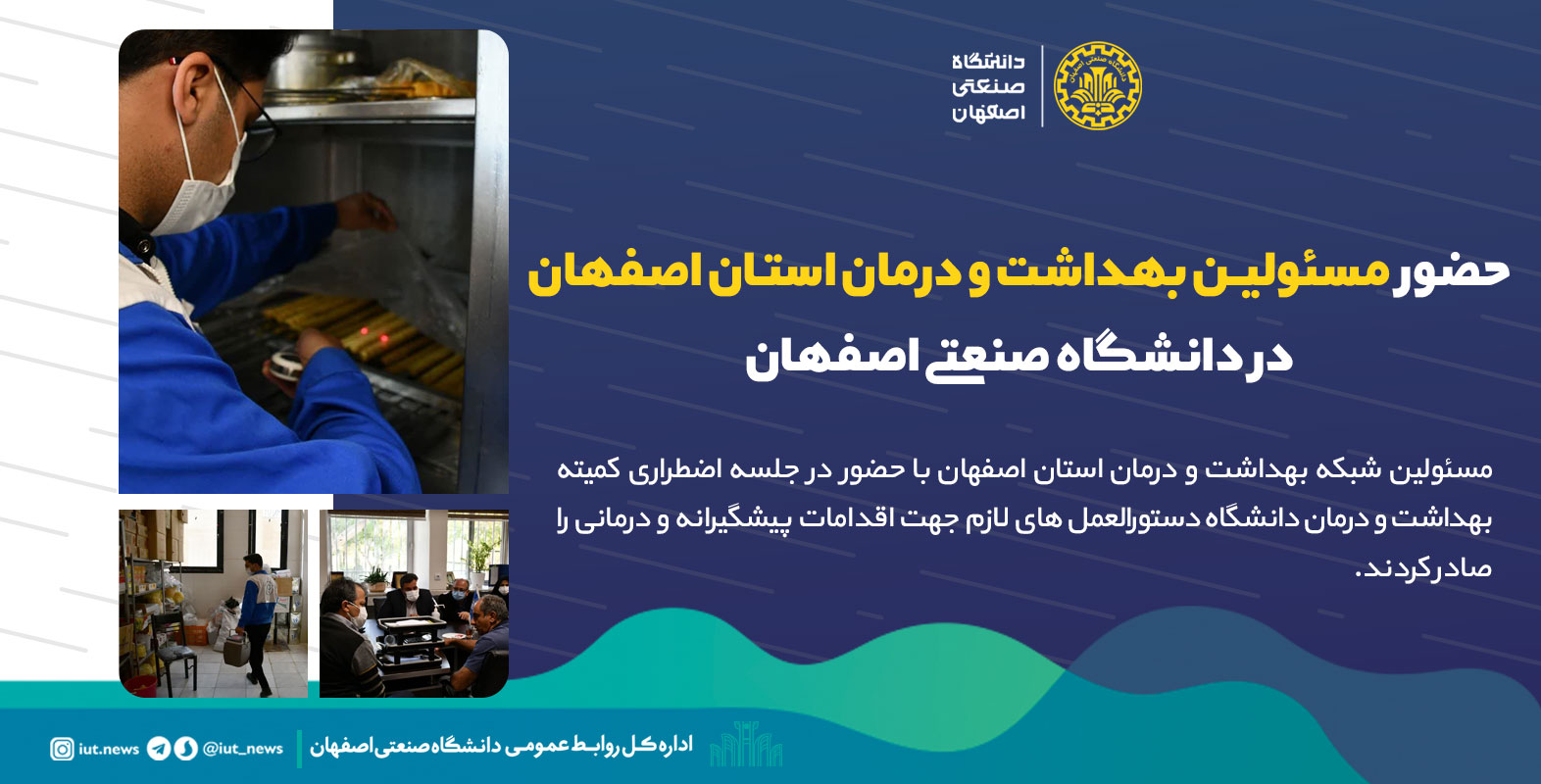 در پی بروز مشکلات گوارشی تعدادی از دانشجویان دانشگاه صنعتی اصفهان روز گذشته جمعه 4 آذرماه، مسئولین شبکه بهداشت و درمان استان اصفهان با حضور در جلسه اضطراری کمیته بهداشت و درمان دانشگاه دستورالعمل های لازم جهت اقدامات پیشگیرانه و درمانی را صادر کردند.