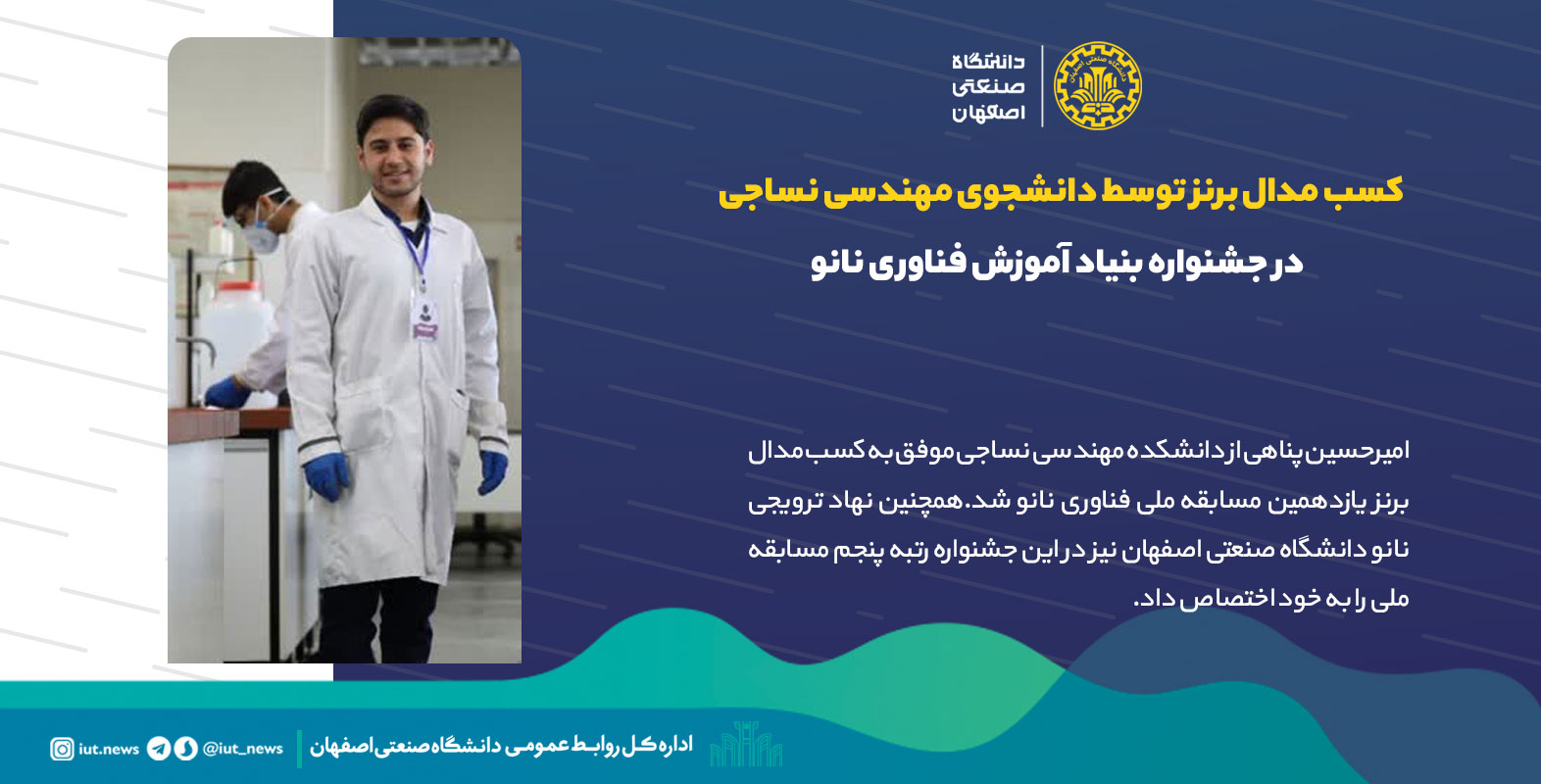 به گزارش اداره کل روابط عمومی دانشگاه صنعتی اصفهان امیرحسین پناهی از دانشکده مهندسی نساجی موفق به کسب مدال برنز یازدهمین مسابقه ملی فناوری نانو شد.همچنین نهاد ترویجی نانو دانشگاه صنعتی اصفهان نیز در این جشنواره رتبه پنجم مسابقه ملی را به خود اختصاص داد.
