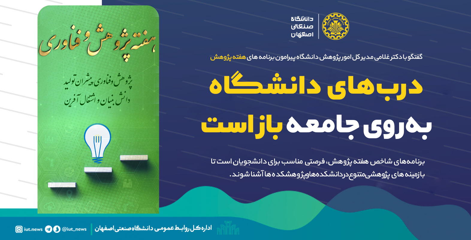 دکتر غلامی از برنامه درب های باز دانشگاه به روی جامعه در این هفته خبر داد و گفت: دانشکده مهندسی کشاورزی، دانشکده مهندسی برق و کامپیوتر ، دانشکده شیمی و تمام پژوهشکده های دانشگاه صنعتی اصفهان در هفته پژوهش، فرصت هایی برای بازدید دانشجویان، دانش آموزان و متخصصان فراهم آورده اند.