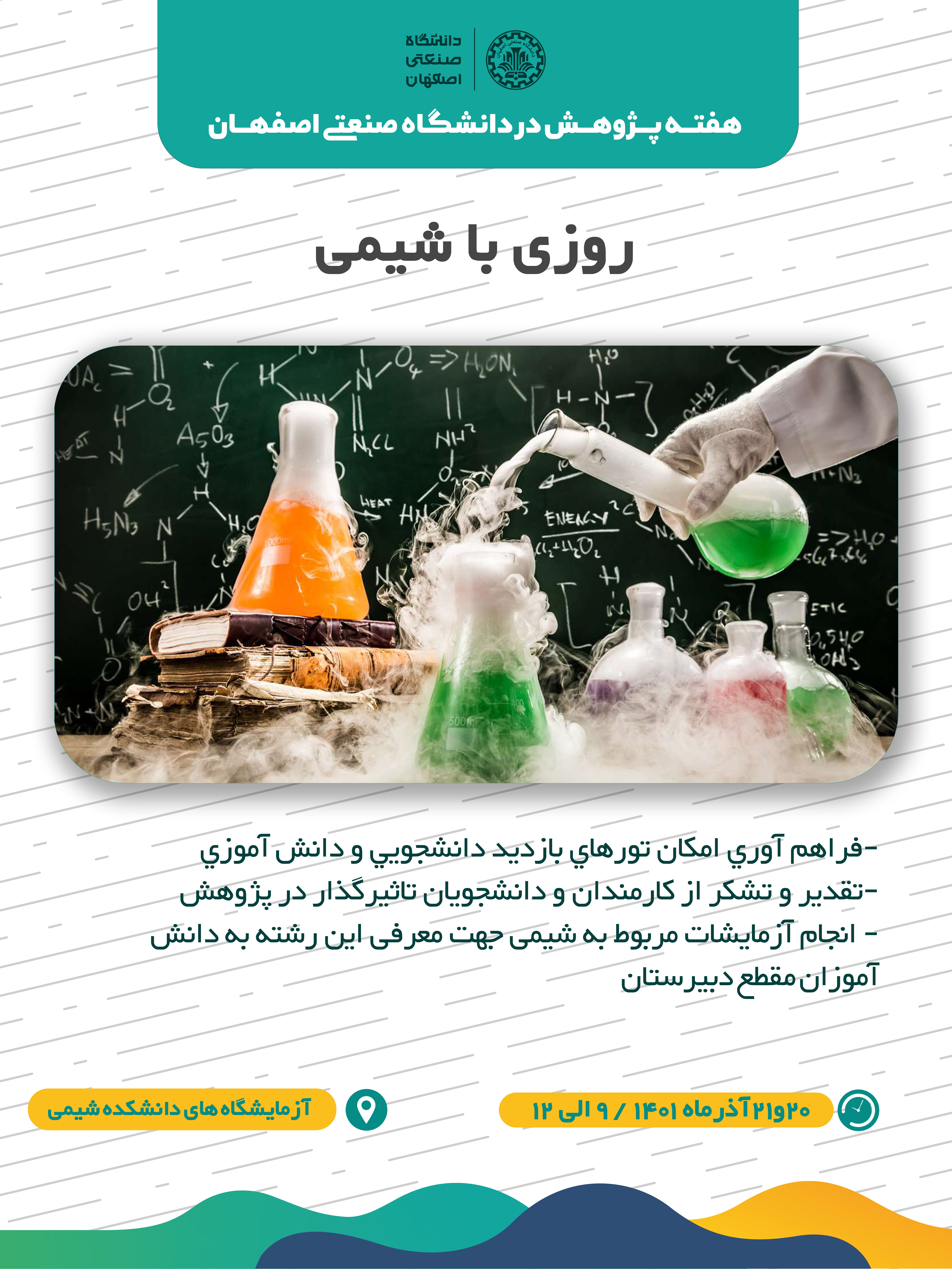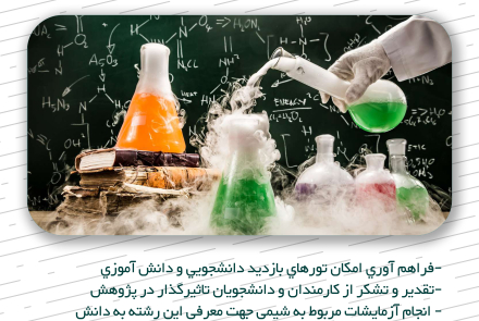 - انجام آزمایشات مربوط به شیمی جهت معرفی این رشته به دانش آموزان مقطع دبیرستان20 21 آذر ماه 1401