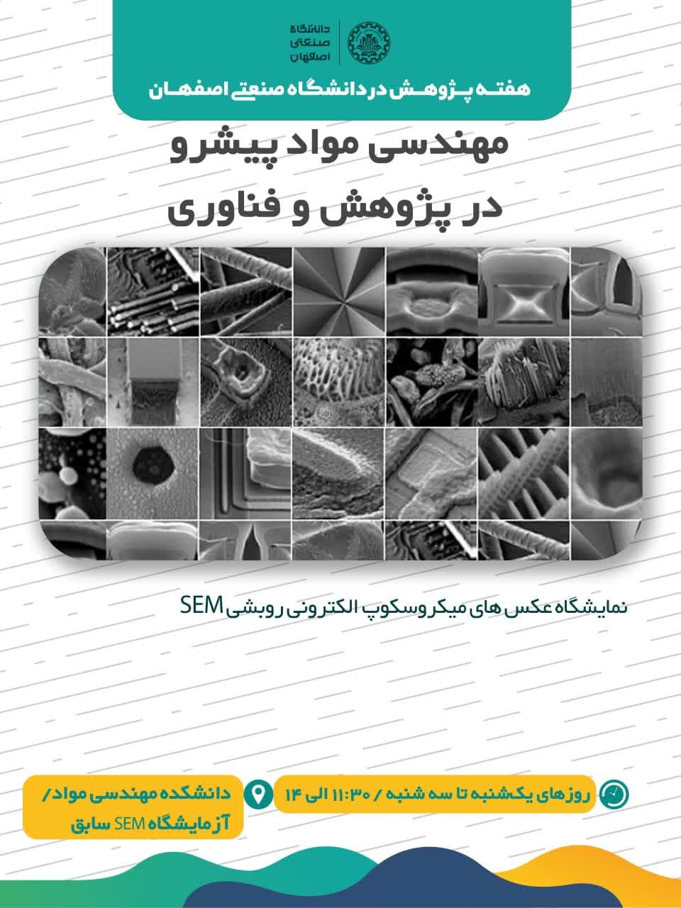11:30 الی 14نمایشگاه عکس های میکروسکوپ الکترونی روبشی SEM روزهای یکشنبه تا سه شنبه، ساعت 14-11:30، آزمایشگاه SEM سابق