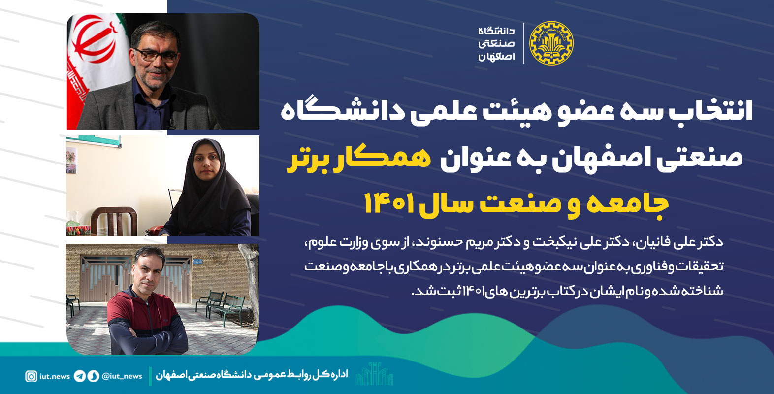 دکتر علی فانیان، دکتر علی نیکبخت و دکتر مریم حسنوند ، از سوی وزارت علوم، تحقیقات و فناوری به عنوان سه عضو هیئت علمی برتر در همکاری با جامعه و صنعت شناخته شده و نام ایشان در کتاب برترین های 1401 ثبت شد.