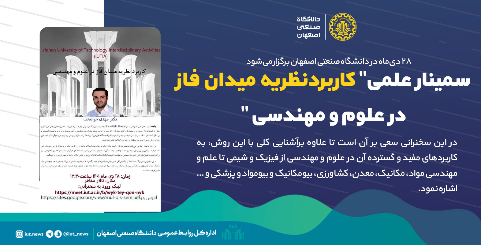 در راستای سلسله سخنرانی های بین رشته ای دانشگاه صنعتی اصفهان سمینار علمی ' کاربرد نظریه میدان فاز در علوم و مهندسی' در تاریخ 28 دیماه در دانشگاه صنعتی اصفهان برگزار می شود.