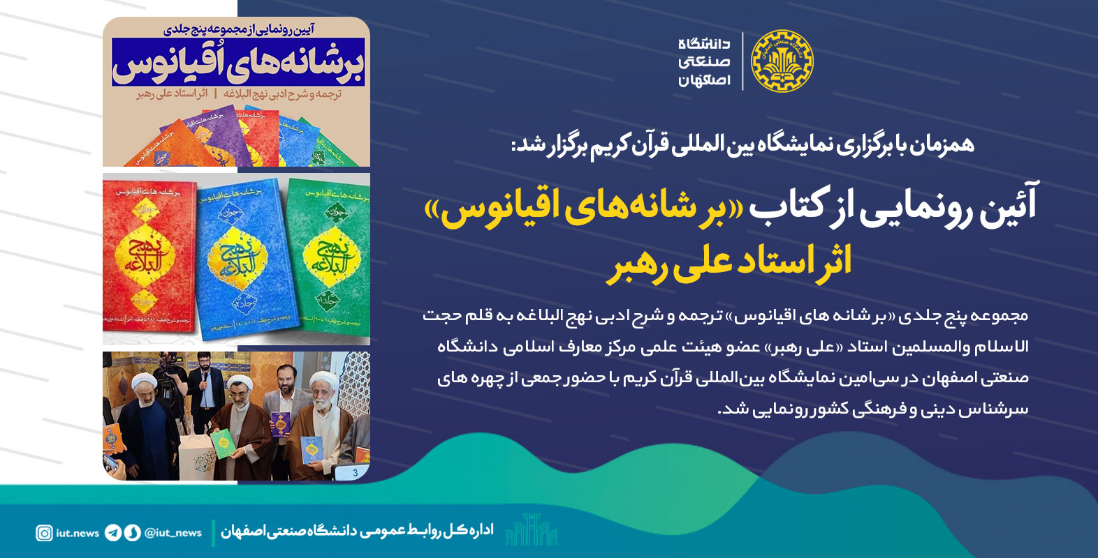 مجموعه پنج جلدی «بر شانه های اقیانوس» ترجمه و شرح ادبی نهج البلاغه به قلم حجت الاسلام والمسلمین استاد «علی رهبر» عضو هیئت علمی مرکز معارف اسلامی دانشگاه صنعتی اصفهان روز ۱۴ فروردین ماه در سیامین نمایشگاه بینالمللی قرآن کریم با حضور جمعی از چهره های سرشناس دینی و فرهنگی کشور رونمایی شد.