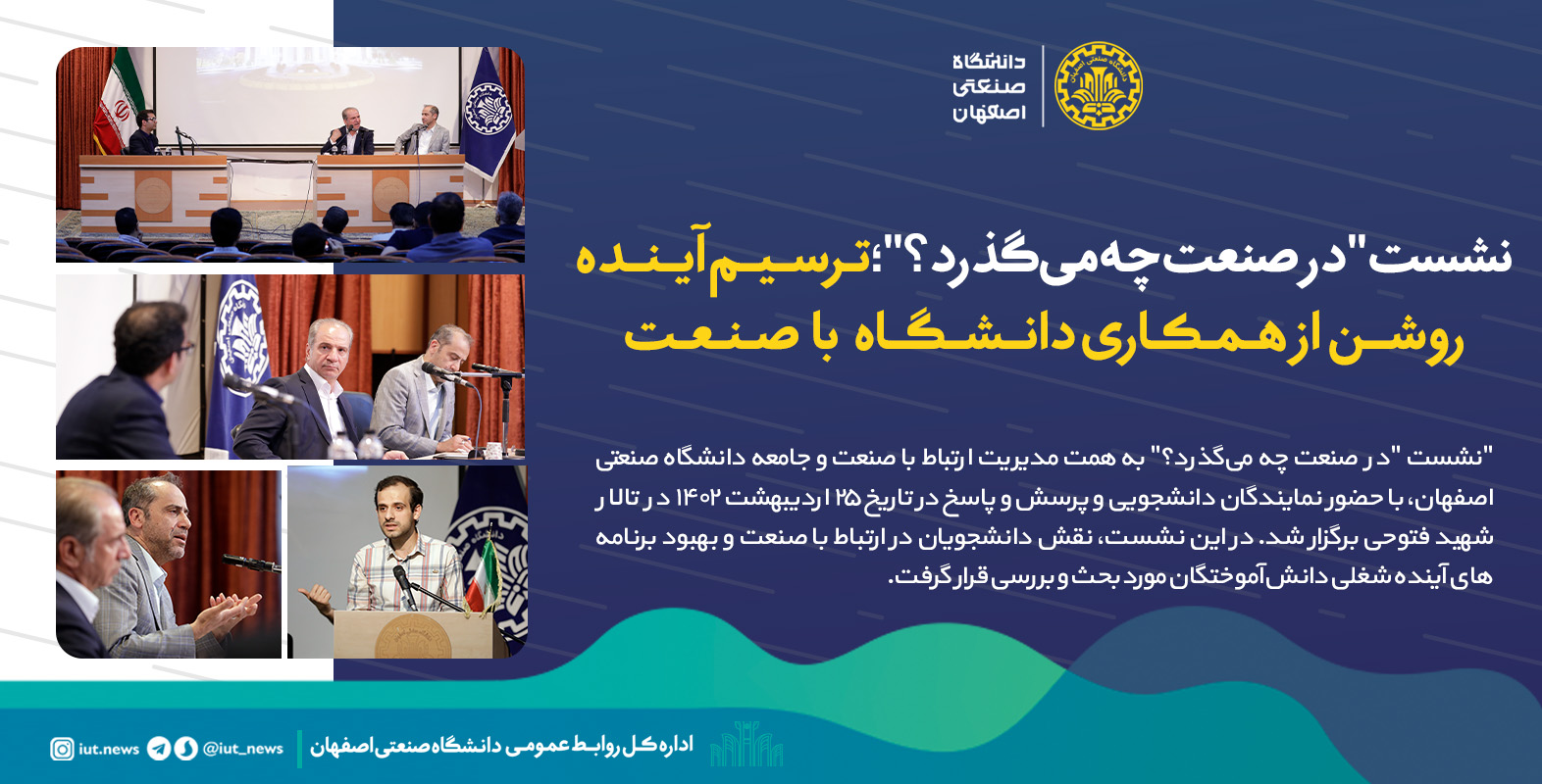 'نشست 'در صنعت چه میگذرد؟' به همت مدیریت ارتباط با صنعت و جامعه دانشگاه صنعتی اصفهان، با حضور نمایندگان دانشجویی و پرسش و پاسخ در تاریخ 25 اردیبهشت 1402 در تالار شهید فتوحی برگزار شد. در این نشست، نقش دانشجویان در ارتباط با صنعت و بهبود برنامههای آینده شغلی دانشآموختگان مورد بحث و بررسی قرار گرفت.