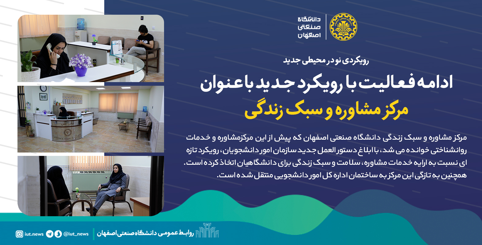 مرکز مشاوره و سبک زندگی دانشگاه صنعتی اصفهان که پیش از این مرکزمشاوره و خدمات روانشناختی خوانده می شد، با ابلاغ دستور العمل جدید سازمان امور دانشجویان، رویکرد تازه ای نسبت به ارایه خدمات مشاوره، سلامت و سبک زندگی برای دانشگاهیان اتخاذ کرده است. همچنین به تازگی این مرکز به ساختمان اداره کل امور دانشجویی منتقل شده است.