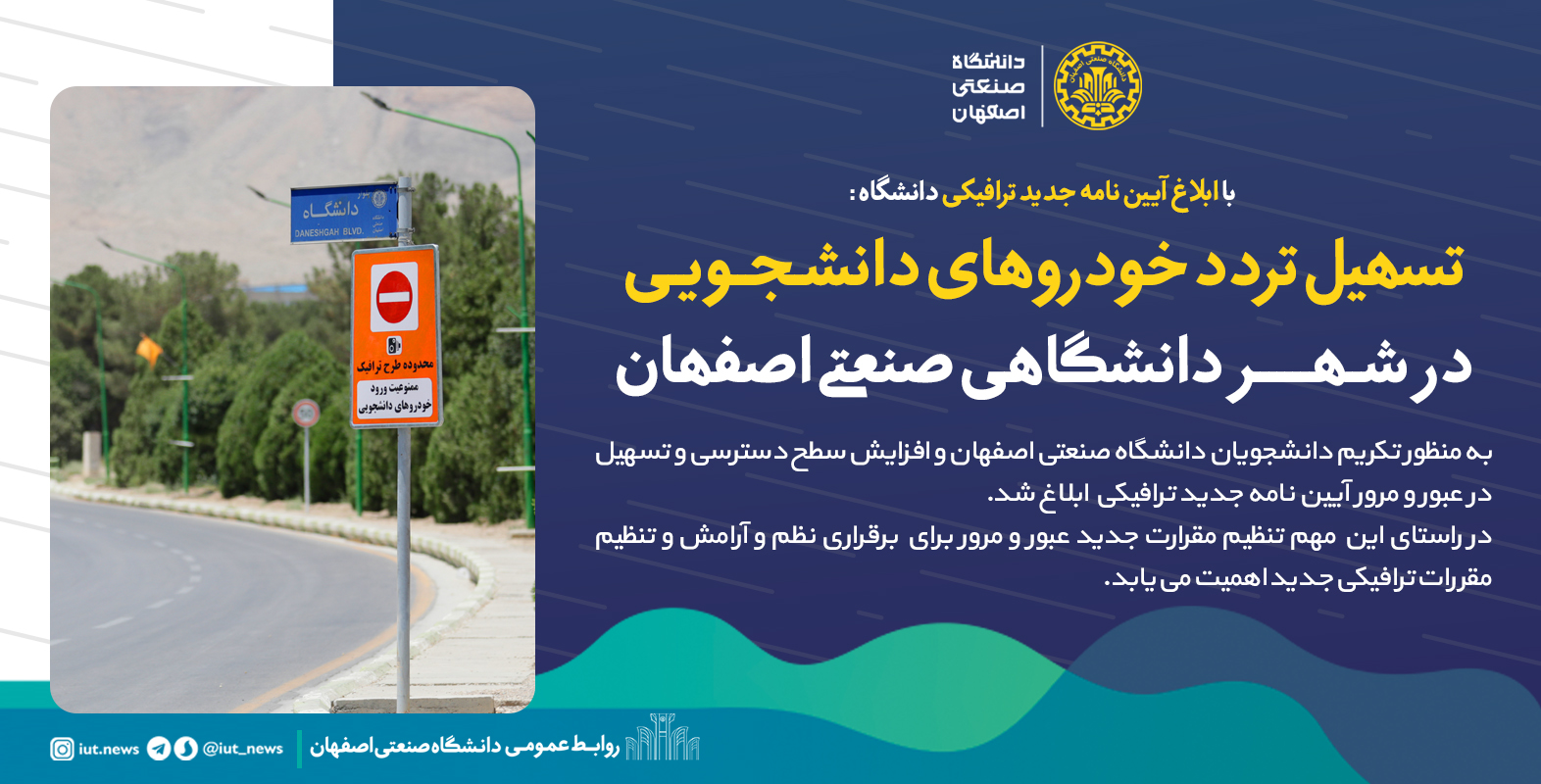 لذا توصیه می شود دانشجویان که از سمت اصفهان به دانشگاه عزیمت می کنند، پس عبور از پل روگذر میدان استقلال، از دوربرگردان زیرگذر (سمت راست جاده) به سمت درب شمالی حرکت کرده و این مسیر ایمن را برای ورود به دانشگاه انتخاب کنند.آئین نامه ترافیکی دانشگاه جهت مطالعه و آگاهی از شرایط و ضوابط مرتبط اینجا در دسترس است