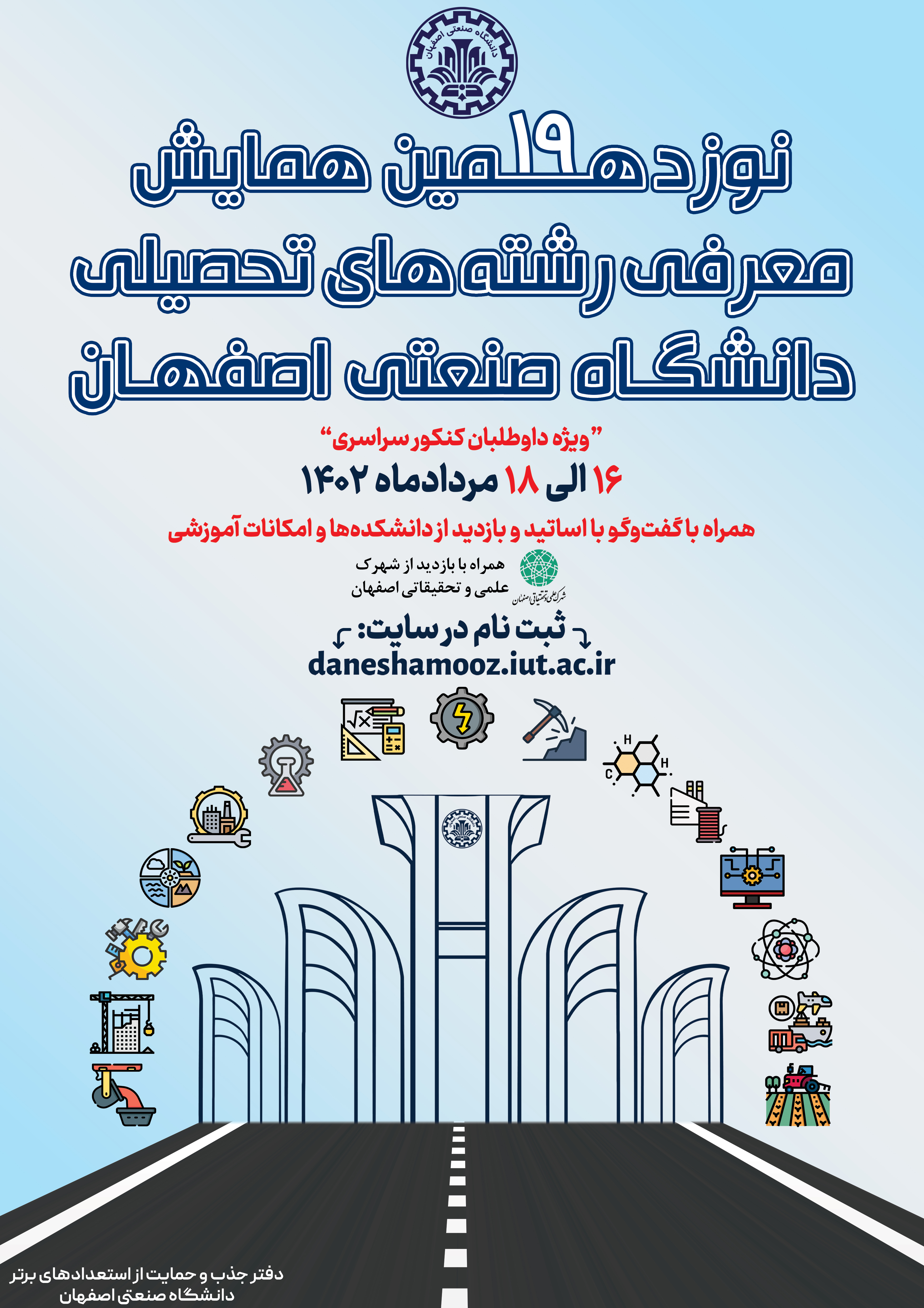 نوزدهمین همایش معرفی رشته های تحصیلی دانشگاه صنعتی اصفهان، همزمان با ایام انتخاب رشته آزمون سراسری و به منظور کمک به داوطلبان کنکور سراسری جهت انجام بهترین انتخاب، از تاریخ 16 تا 18 مردادماه برگزار می گردد.