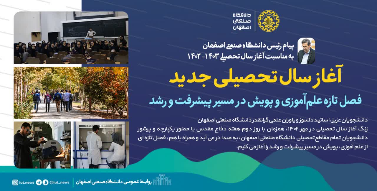 زنگ آغاز سال تحصیلی در مهر 1402، همزمان با آغازین روزهای هفته دفاع مقدس با حضور یکپارچه و پرشور دانشجویان تمام مقاطع تحصیلی دانشگاه صنعتی اصفهان، به صدا در می آید و همراه با هم ، فصل تازه ای از علم آموزی، پویش در مسیر پیشرفت و رشد را آغاز می کنیم.