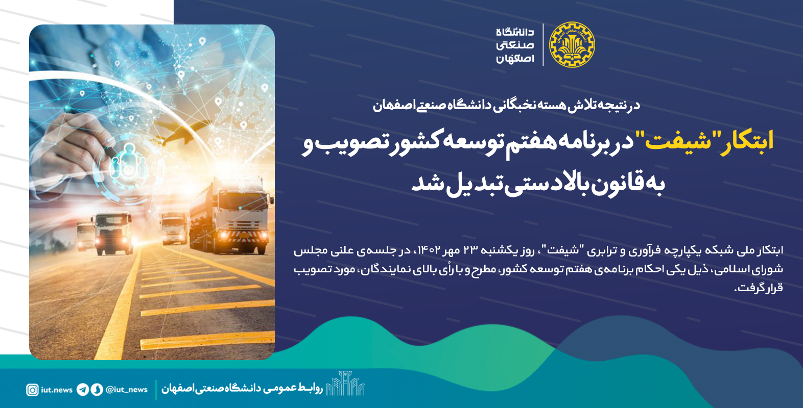 گفتنی است 'طراحی شبکهی یکپارچهی فرآوری و ترابری (شیفت)' در هسته نخبگانی با محوریت دانشگاه صنعتی اصفهان و در قالب طرح شهید دکتر بهشتی بنیاد ملی نخبگان، در خرداد ماه ۱۴۰۲ تصویب شده است و هماکنون در حال انجام است.