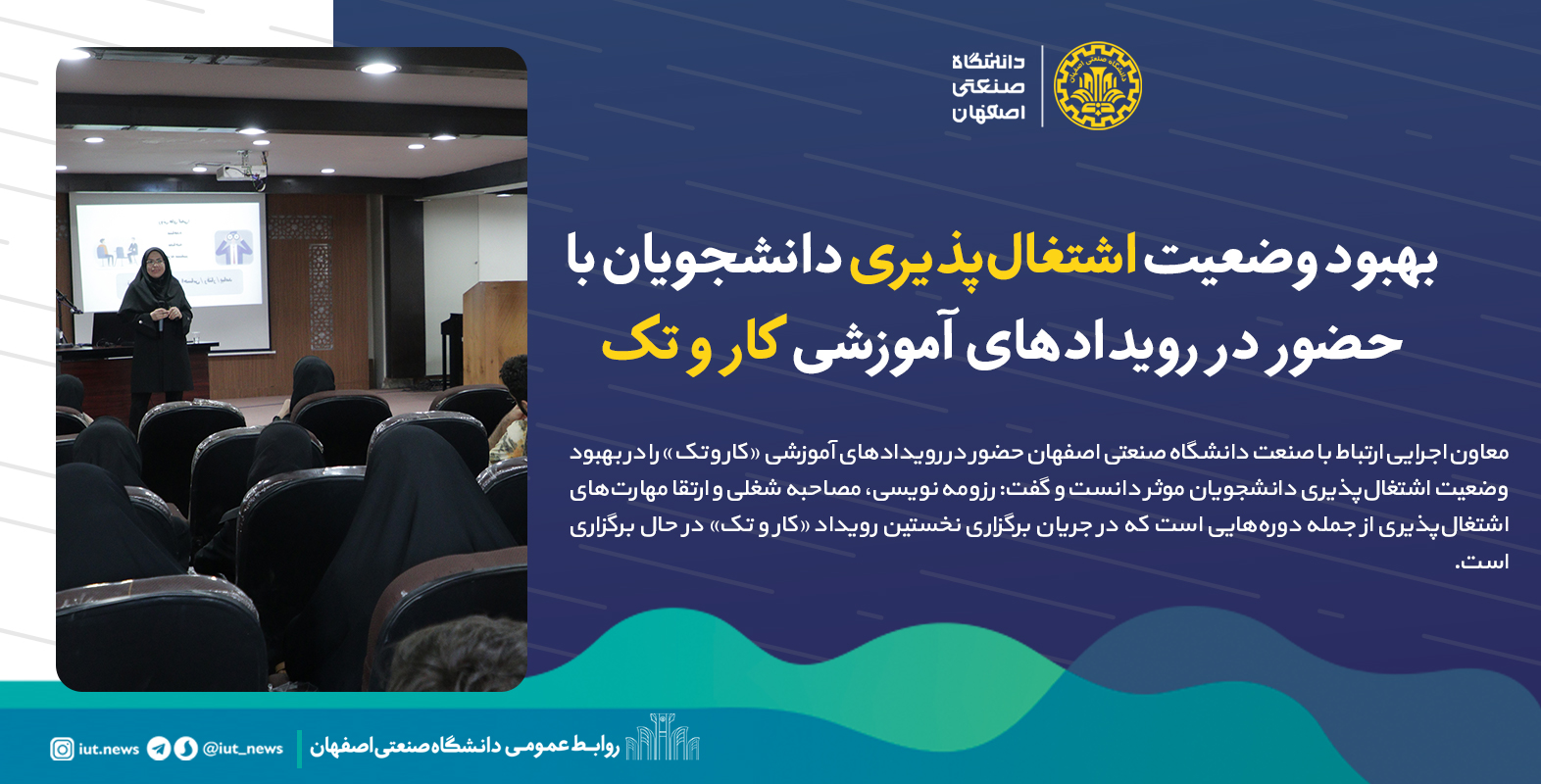 معاون اجرایی ارتباط با صنعت دانشگاه صنعتی اصفهان حضور در رویدادهای آموزشی«کار و تک » را در بهبود وضعیت اشتغالپذیری دانشجویان موثر دانست و گفت: رزومه نویسی، مصاحبه شغلی و ارتقا مهارتهای اشتغالپذیری از جمله دورههایی است که در جریان برگزاری نخستین رویداد «کار و تک» در حال برگزاری است.