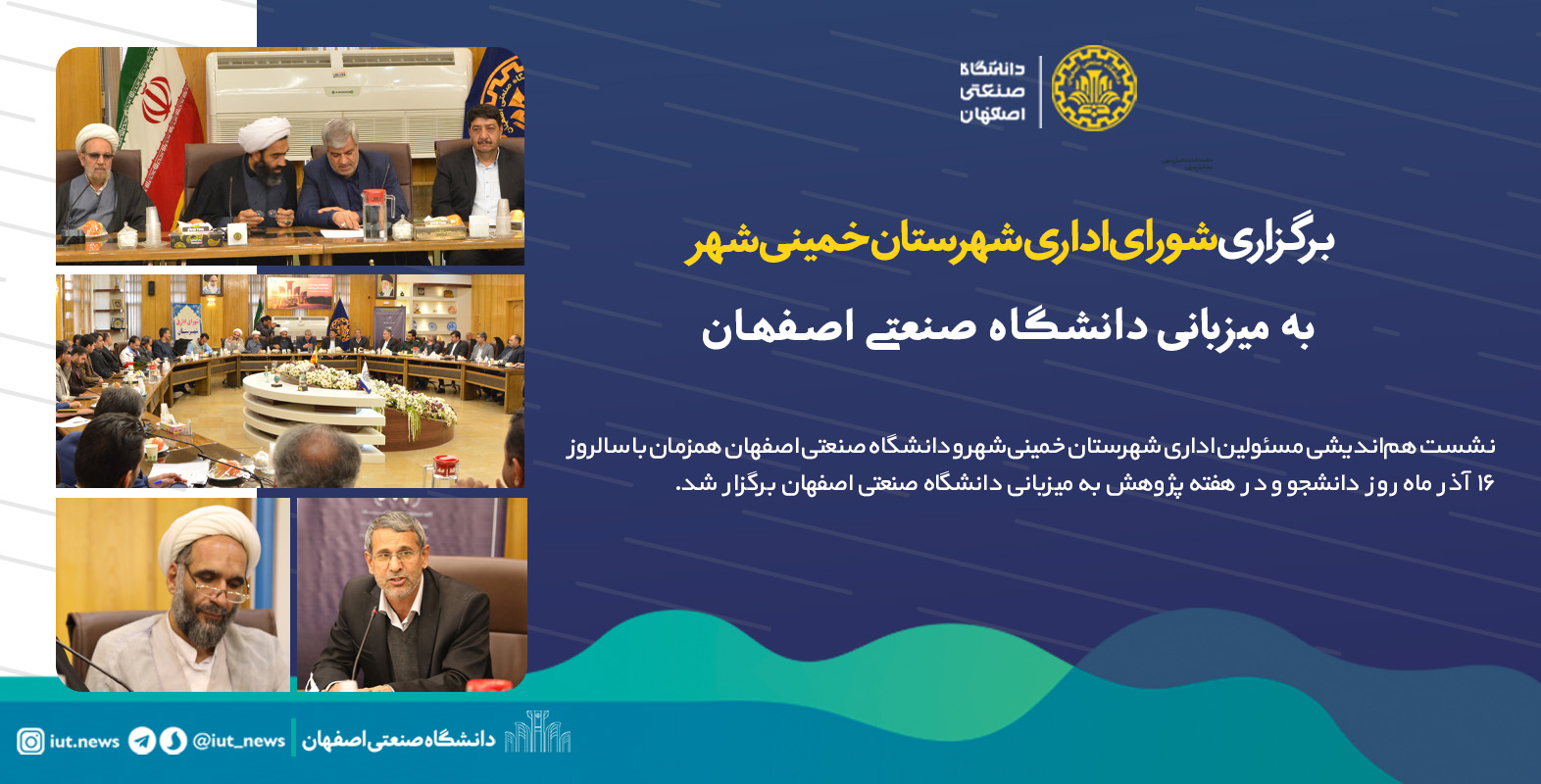 نشست هماندیشی مسئولین اداری شهرستان خمینیشهر و دانشگاه صنعتی اصفهان همزمان با سالروز ۱۶ آذرماه روز دانشجو و در هفته پژوهش به میزبانی دانشگاه صنعتی اصفهان برگزار شد.