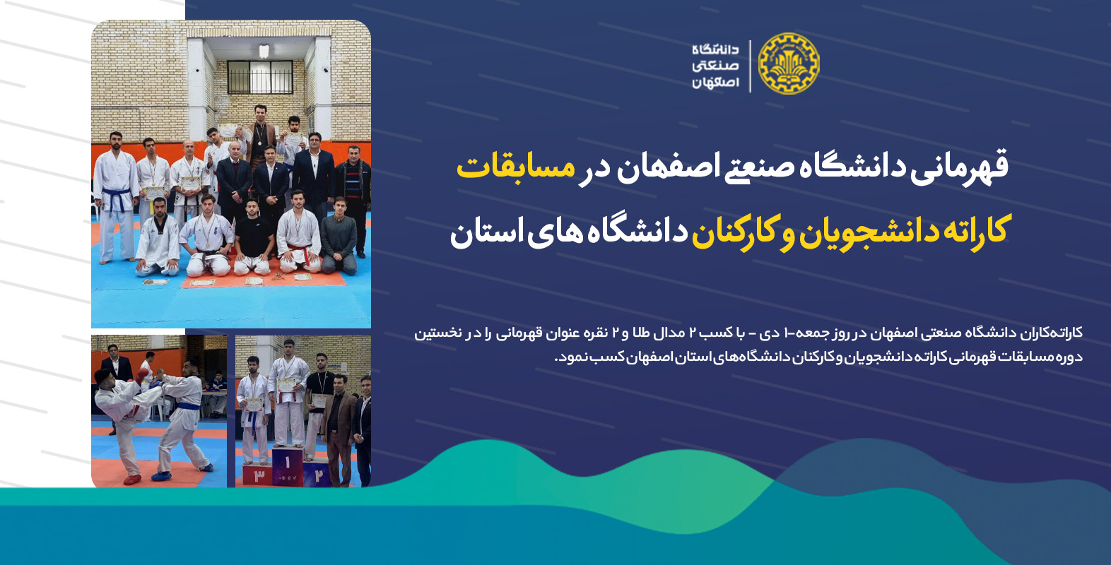 کاراتهکاران دانشگاه صنعتی اصفهان در روز جمعه-۱ دی - با کسب ۲ مدال طلا و ۲ نقره عنوان قهرمانی را در نخستین دوره مسابقات قهرمانی کاراته دانشجویان و کارکنان دانشگاههای استان اصفهان کسب نمود.