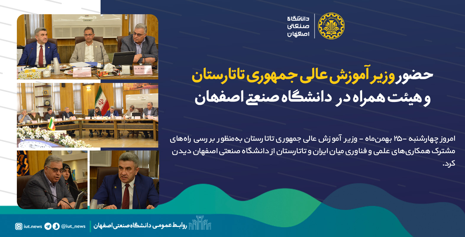 امروز چهارشنبه -۲۵ بهمنماه - وزیر آموزش عالی جمهوری تاتارستان بهمنظور بررسی راههای مشترک همکاریهای علمی و فناوری میان ایران و تاتارستان از دانشگاه صنعتی اصفهان دیدن کرد.