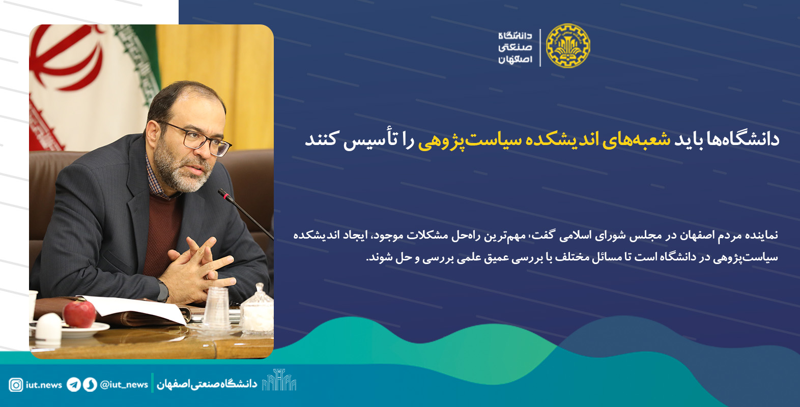 نماینده مردم اصفهان در مجلس شورای اسلامی تصریح کرد: بنده در سال ۱۴۰۱ پیشنهاد ایجاد اندیشکده سیاستپژوهی در موضوعات مختلف را در دانشگاهها مطرح کردم. هماکنون بهصورت ویژه در حوزههای کشاورزی، معدن، خودرو، اقلیم و محیطزیست نیاز به سیاستپژوهی داریم. مرکز پژوهشهای مجلس نزدیک به دو سال است که سعی در برقراری ارتباط با دانشگاهها برای انجام این امر دارد؛ اما لازمه پیشرفت در سیاستگذاری، ایجاد شعبه قوی سیاستپژوهی در دانشگاهها است.