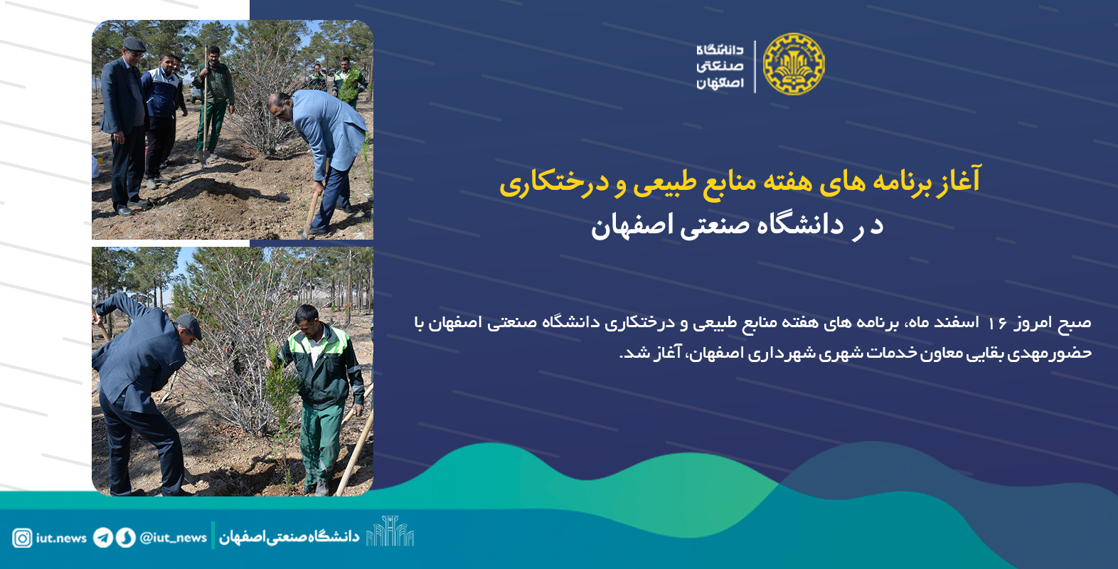 صبح امروز 16 اسفند ماه، برنامه های هفته منابع طبیعی و درختکاری دانشگاه صنعتی اصفهان با حضورمهدی بقایی معاون خدمات شهري شهرداری اصفهان، آغاز شد.