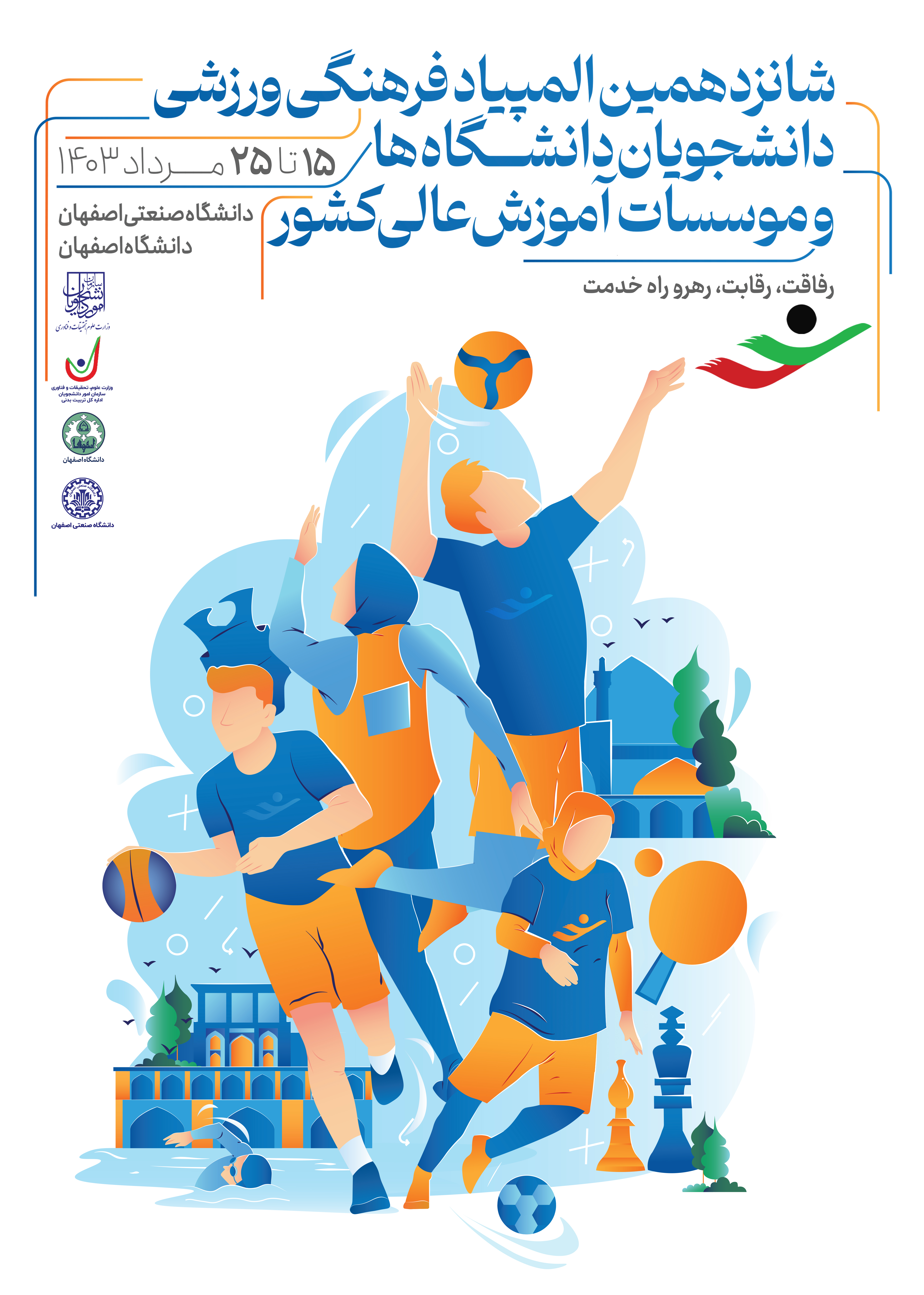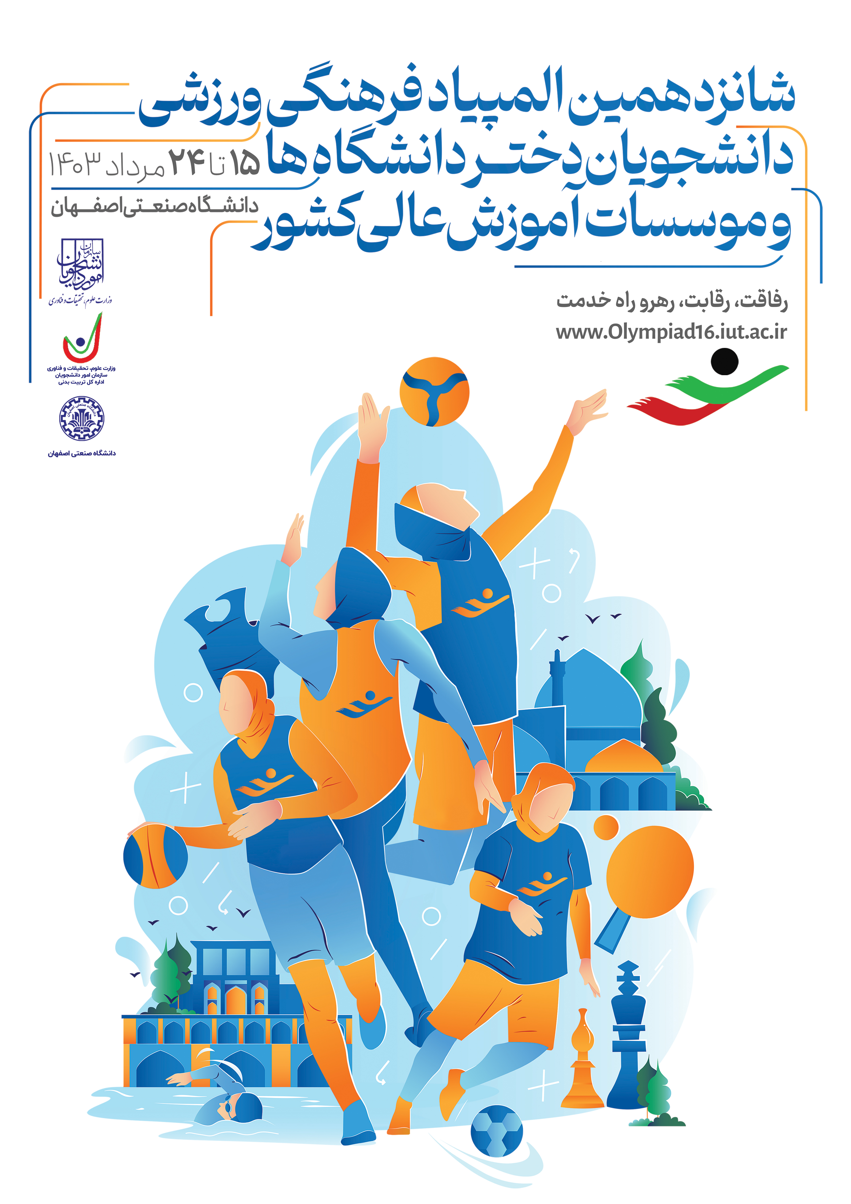 شانزدهمین المپیاد فرهنگی- ورزشی دانشجویان سراسر کشور در بخش دختران در 13 رشته ورزشی از 15 مرداد تا 24 مرداد ماه به میزبانی دانشگاه صنعتی اصفهان و در بخش پسران در 16 رشته ورزشی از 16 تا 25 مرداد ماه به میزبانی دانشگاه اصفهان برگزار میشود.
