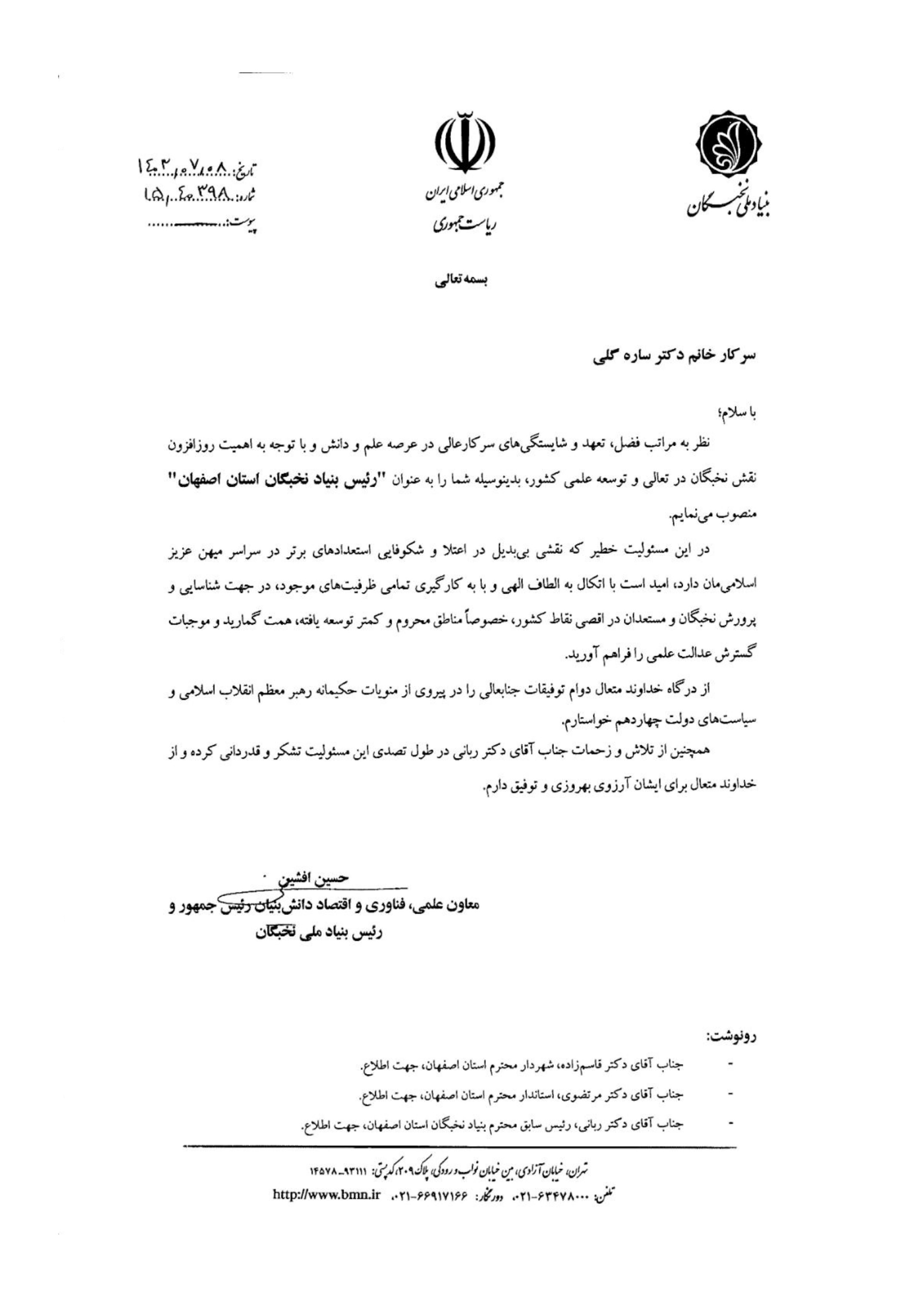 دکتر ساره گلی استادیار دانشکده ریاضی دانشگاه صنعتی اصفهان،از سوی دکتر حسین افشین، معاون رئیسجمهور بهعنوان 'رئیس بنیاد ملی نخبگان اصفهان' منصوب شد.