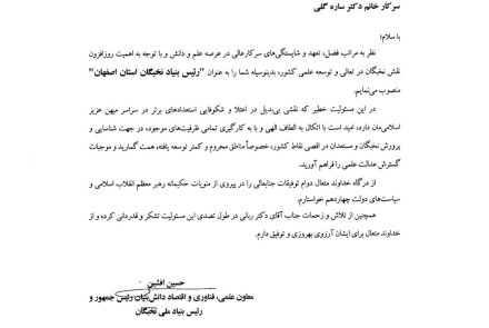 در بخشی از حکم انتصاب آمده است: «در این مسئولیت خطیر که نقشی بیبدیل در اعتلا و شکوفایی استعدادهای برتر در سراسر میهن عزیز اسلامیمان دارد امید است با اتکال به الطاف الهی و با بهکارگیری تمامی ظرفیتهای موجود در جهت شناسایی و پرورش نخبگان و مستعدان در اقصینقاط کشور خصوصاً مناطق محروم و کمتر توسعهیافته، همت گمارید و موجبات گسترش عدالت علمی را فراهم آورید.»