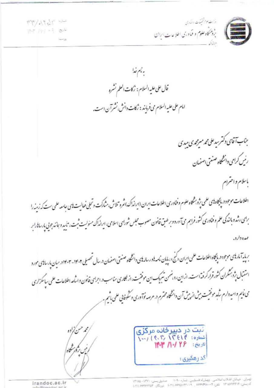 وی خاطرنشان ساخت: بر طبق قانون مصوب شورای اسلامی، ایرانداک مسئولیت ثبت، تأیید و همانندجویی پارساها را برعهده دارد و در پایان این تقدیرنامه افزود: ضمن تبریک موفقیت به دانشگاه صنعتی اصفهان، از همکاری مناسب در اجرای قانون و اشاعه اطلاعات علمی سپاسگزاری مینمایم و امیدوارم شاهد موفقیت بیشازپیش آن دانشگاه محترم در عرصه نوآوری و شکوفایی علمی باشیم.