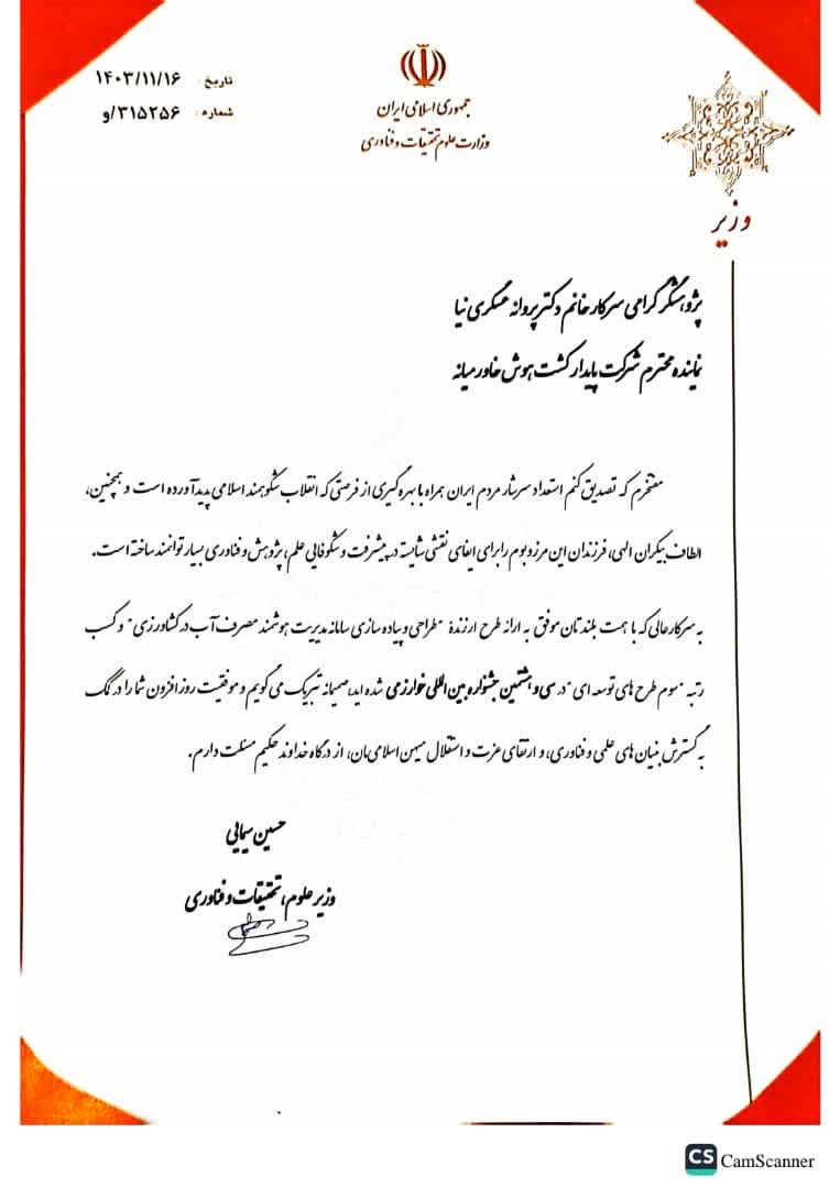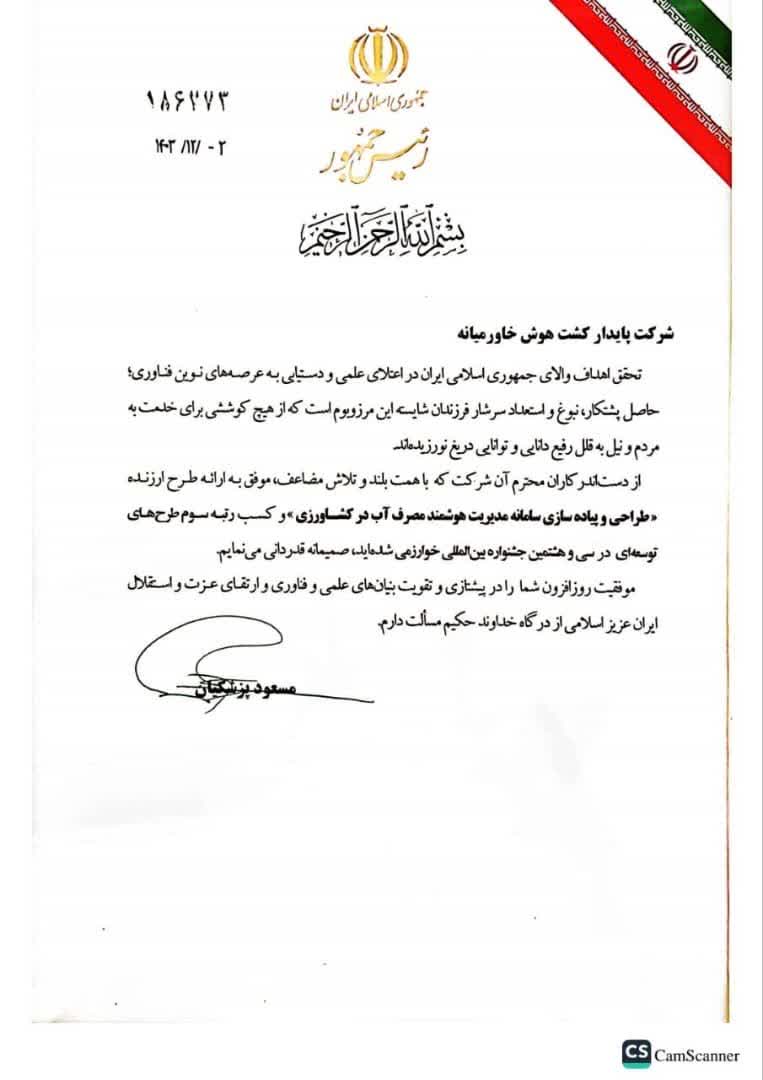این شرکت با مدیریت دکتر مهدی قیصری، عضو هیئتعلمی دانشگاه صنعتی اصفهان، موفق شد با مشارکت ۲۵ درصدی، رتبه سوم بخش طرحهای توسعهای را در این جشنواره کسب کند. دکتر پروانه عسگری نیا، پژوهشگر و مدیرعامل این شرکت، لوح تندیس و جایزه جشنواره بینالمللی خوارزمی را از دستان دکتر مسعود پزشکیان، رئیسجمهور، دریافت کرد.گفتنی است «این سامانه با هدف بهینهسازی مصرف آب در بخش کشاورزی و استفاده از فناوریهای نوین طراحی شده است و میتواند نقش مؤثری در مدیریت پایدار منابع آبی کشور ایفا کند.» جشنواره بینالمللی خوارزمی به عنوان یکی از معتبرترین رویدادهای علمی کشور، هر ساله با هدف شناسایی و تقدیر از پژوهشگران، مخترعان و فناوران برتر در حوزههای مختلف علمی برگزار میشود.