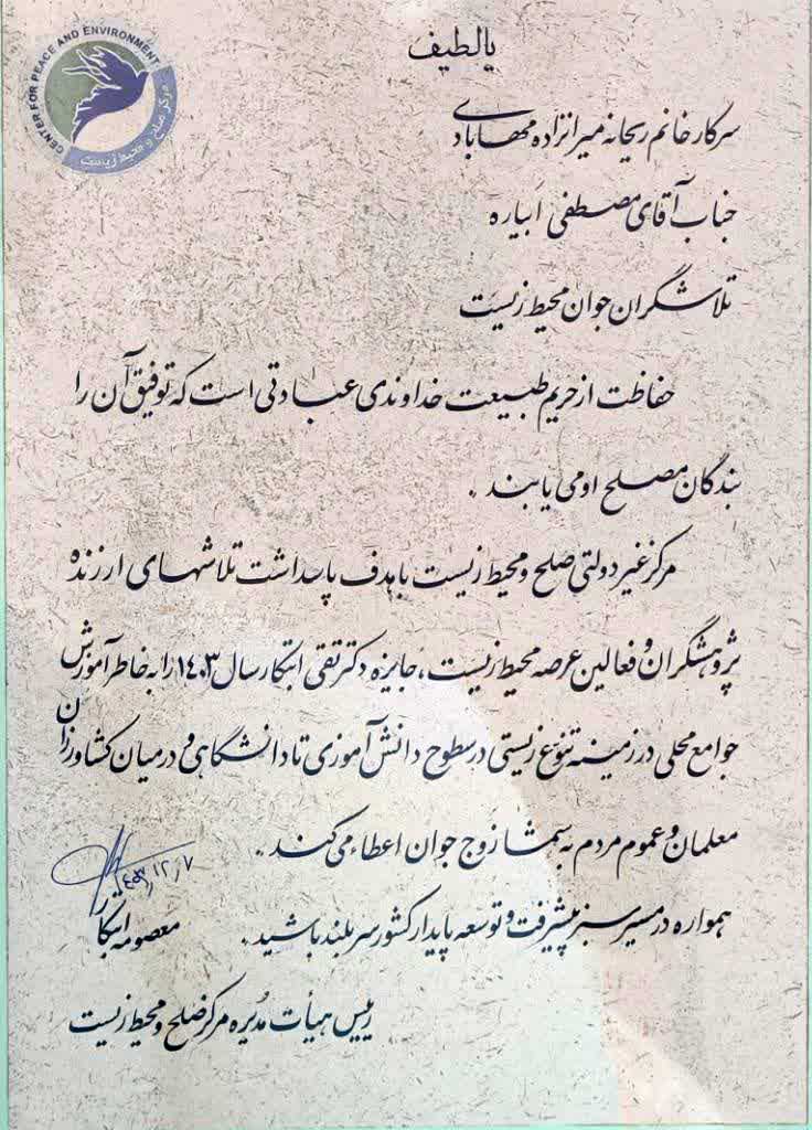 ریحانه میرانزاده مهابادی و مصطفی ابیاره، زوج فعال محیطزیست و عضو دانشگاه صنعتی اصفهان، بهپاس تلاشهای گسترده در آموزش جوامع محلی و حفاظت از تنوع زیستی، جایزهٔ بیستمین دورهٔ «دکتر تقی ابتکار» را در مراسمی با حضور فعالان و پیشکسوتان محیطزیست در تهران دریافت کردند.