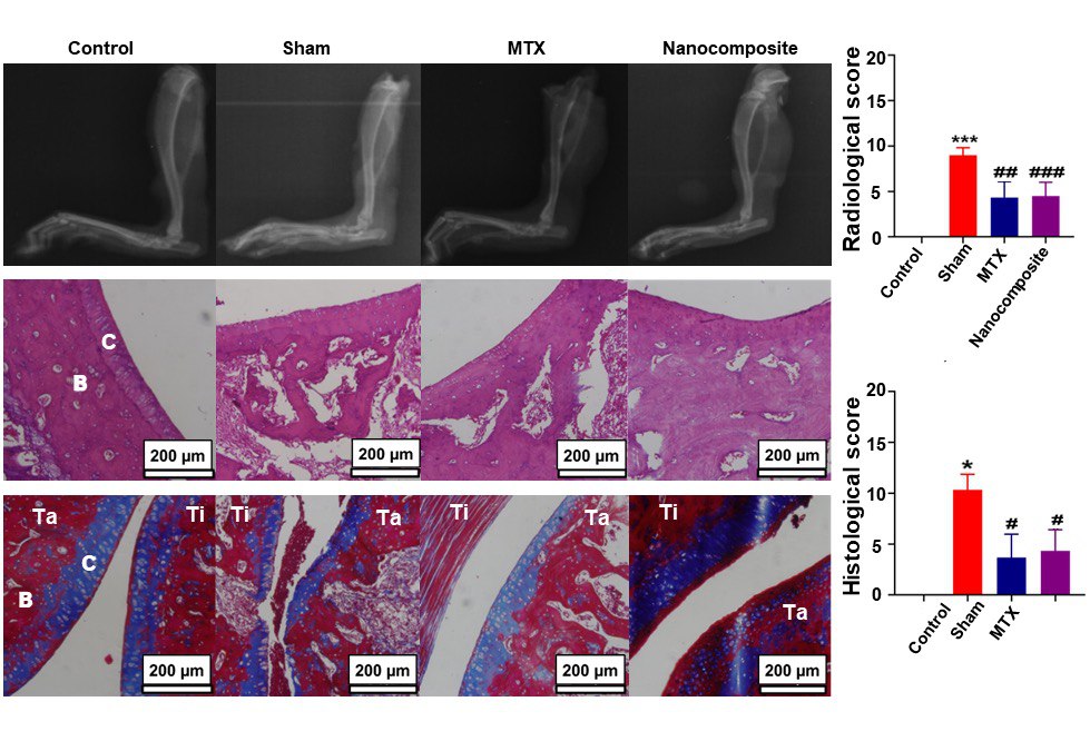 وی با اشاره به بررسی ویژگیهای ضد التهابی این نانوکامپوزیت در فاز برونتنی بر روی رده سلول های ماکروفاژی موش و نیز ارزیابی آن در شرایط درونتنی بر روی مدلهای رماتیسم این حیوان، بیان کرد: معاینات بالینی، میزان فاکتورهای التهابی در خون، عکسهای رادیولوژی، و رنگآمیزی بافت مفصل نشان دادند که نانوکامپوزیت تهیه شده کمترین عوارض جانبی را به دنبال داشته و میتواند گزینه مناسبی برای درمان رماتیسم باشد.