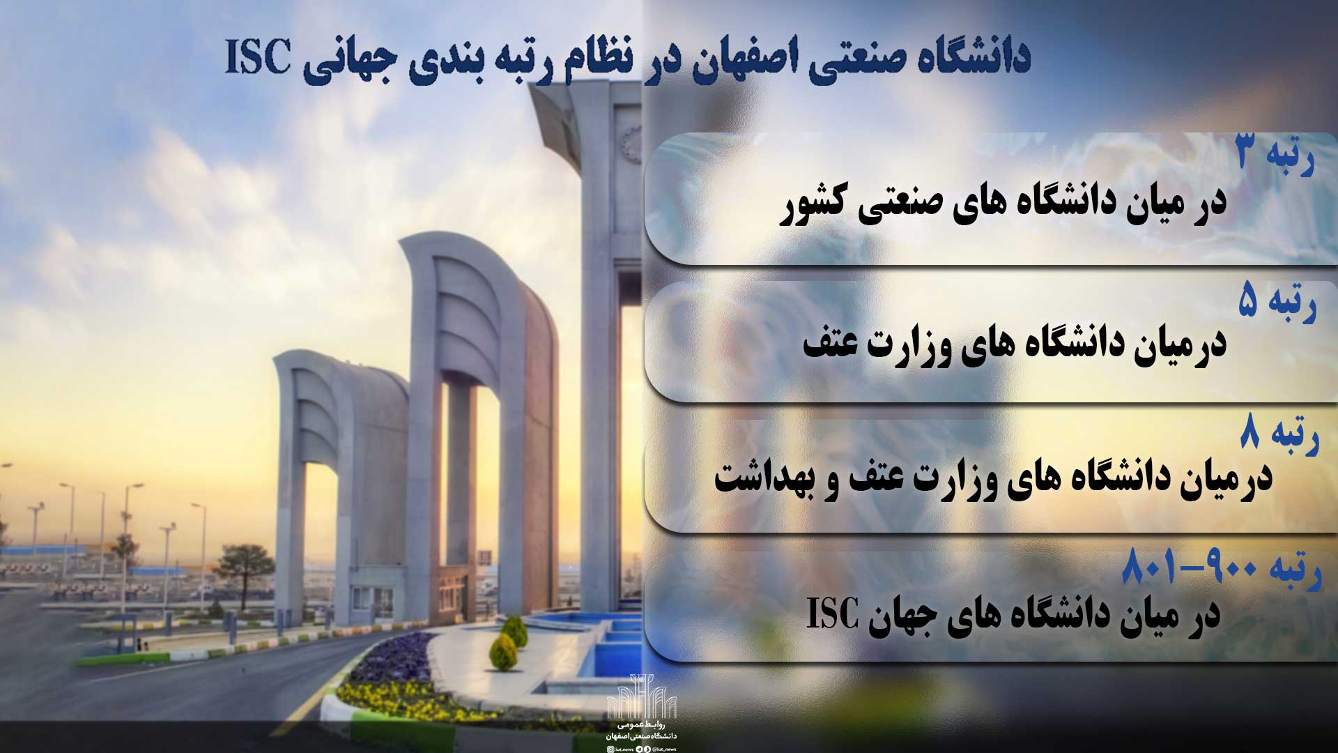 بر اساس آخرین رتبه بندی جهانی مؤسسه استنادی و پایش علم و فناوری جهان اسلام ISC، دانشگاه صنعتی اصفهان در رتبه 8 برترین دانشگاه های وزارت بهداشت و وزارت عتف، رده 5 برترین دانشگاه های وزارت عتف و سومین دانشگاه صنعتی برتر کشور معرفی شد.