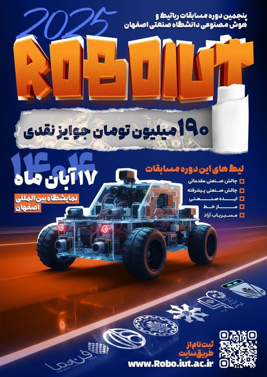 پنجمین دوره مسابقات رباتیک و هوش مصنوعی دانشگاه صنعتی اصفهان(ROBOIUT) 17 الی 20 آبان ماه در محل نمایشگاه های بین المللی امیرکبیر اصفهان برگزار می شود.