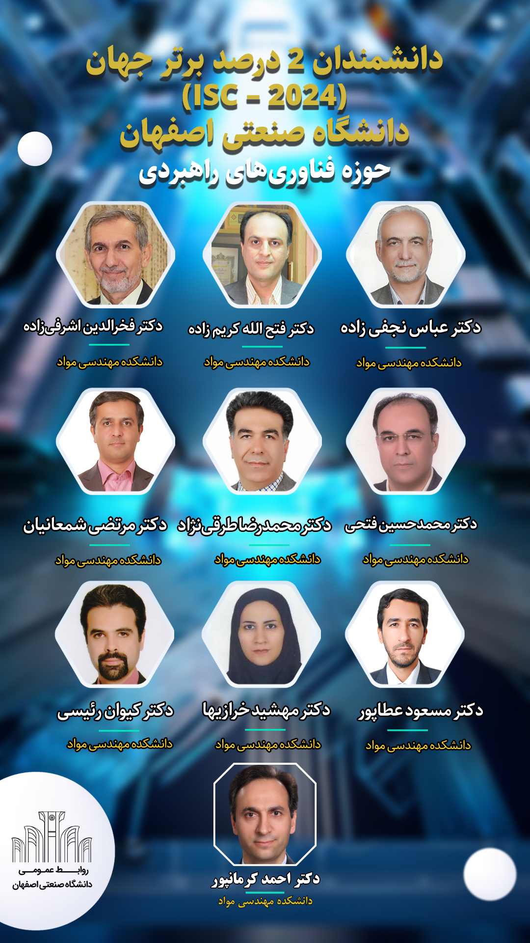 درحوزه فناوری های راهبردی (هوش مصنوعی، نانو و ...)، دکتر عباس نجفی زاده، دکتر فتح اله کریم زاده، دکتر فخرالدین اشرفی زاده، دکتر محمدحسین فتحی، دکتر محمدرضا طرقی نژاد، دکتر مرتضی شمعانیان، دکتر مسعود عطاپور، دکتر مهشید خرازی ها، دکتر کیوان رئیسیو دكتر احمد كرمانپور از اعضای هیأت علمی دانشکده مهندسی مواد دانشگاه صنعتی اصفهان، پژوهشگران 2 درصد برتر این حوزه را به خود اختصاص داده اند.