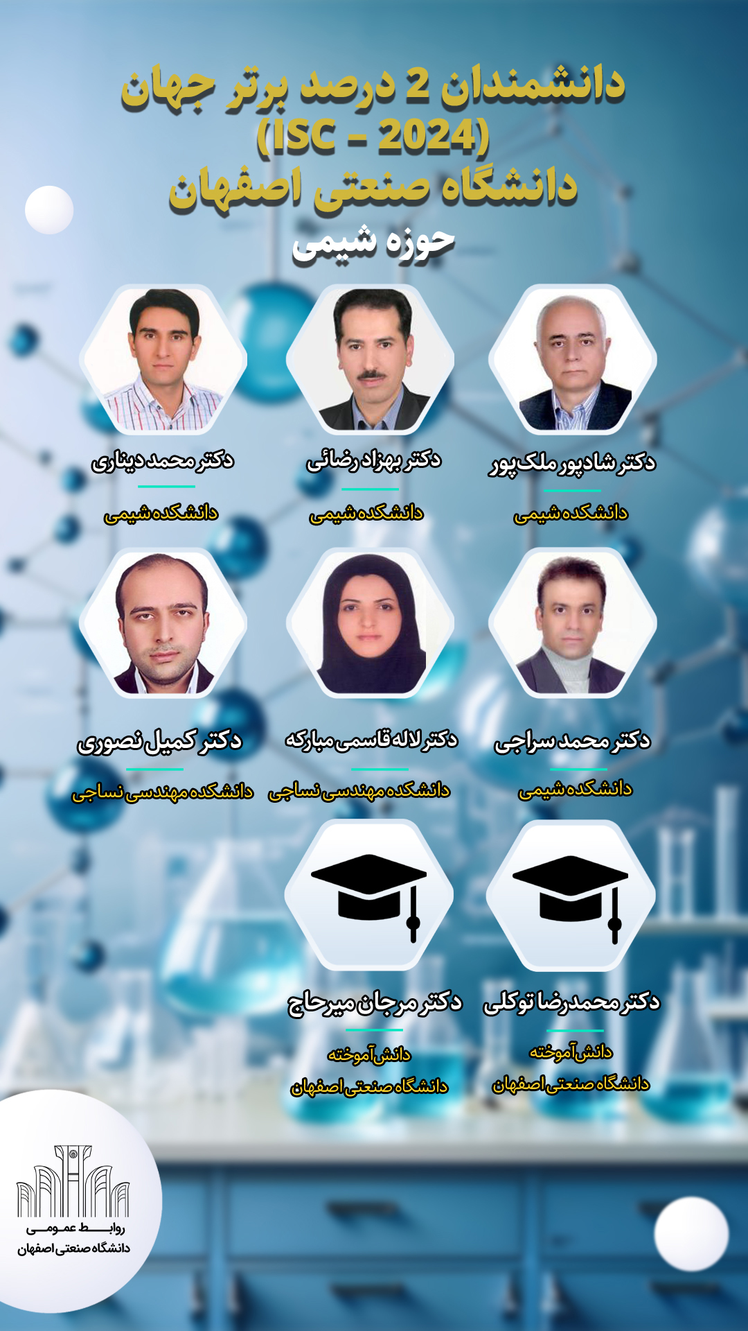 در حوزه موضوعی شیمی، دکتر شادپور ملک پور، دکتر بهزاد رضائی، دکتر محمد دیناری، دکتر محمد سراجی از اعضای هیأت علمی دانشکده شیمی، دکتر لاله قاسمی مبارکه و دکتر کمیل نصوری از اعضای هیأت علمی دانشکده مهندسی نساجی، دکتر محمدرضا توکلی و دکتر مرجان ميرحاج از دانش آموخته گان  دانشگاه صنعتی اصفهان دیگر پژوهشگران 2 درصد برتر جهان اعلامی از سوی isc هستند.