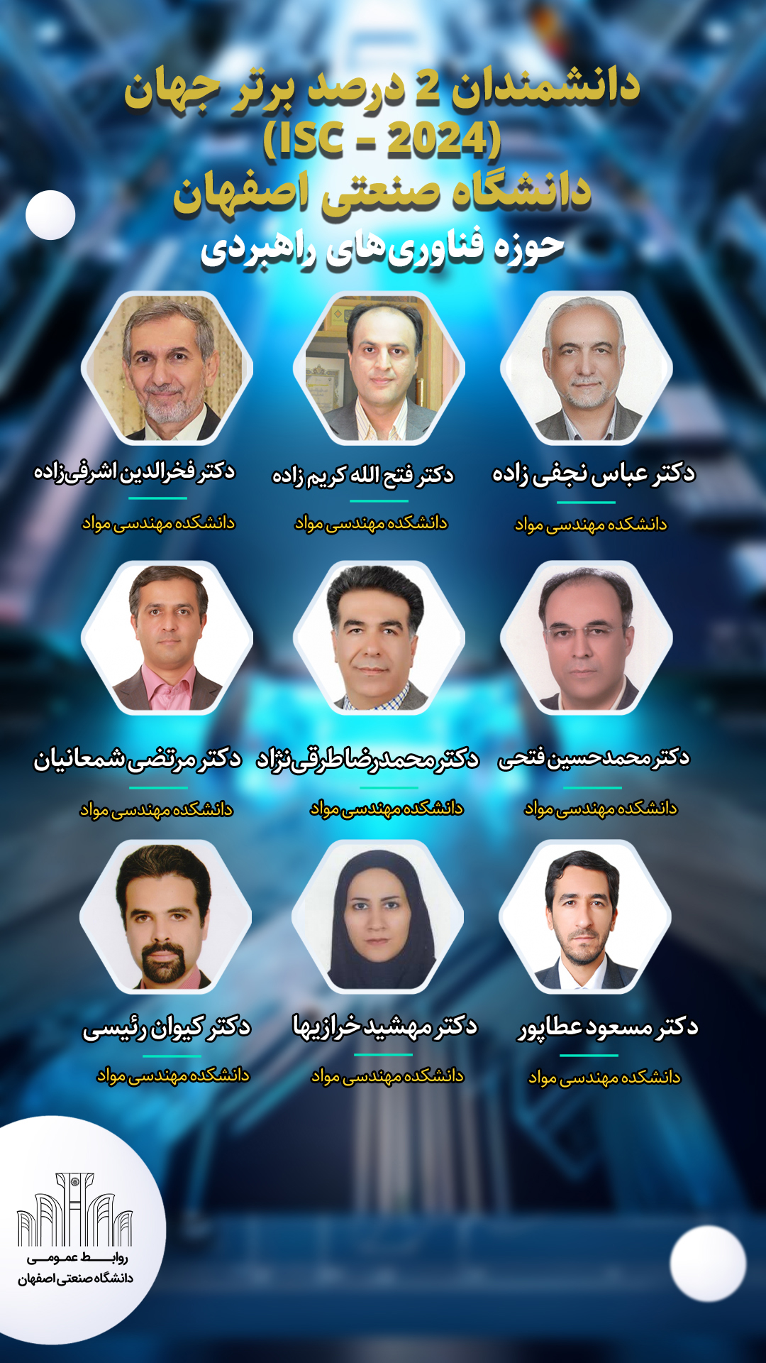 درحوزه فناوری های راهبردی (هوش مصنوعی، نانو و ...)، دکتر عباس نجفی زاده، دکتر فتح اله کریم زاده، دکتر فخرالدین اشرفی زاده، دکتر محمدحسین فتحی، دکتر محمدرضا طرقی نژاد، دکتر مرتضی شمعانیان، دکتر مسعود عطاپور، دکتر مهشید خرازی ها و دکتر کیوان رئیسی از اعضای هیأت علمی دانشکده مهندسی مواد دانشگاه صنعتی اصفهان، پژوهشگران 2 درصد برتر این حوزه را به خود اختصاص داده اند.